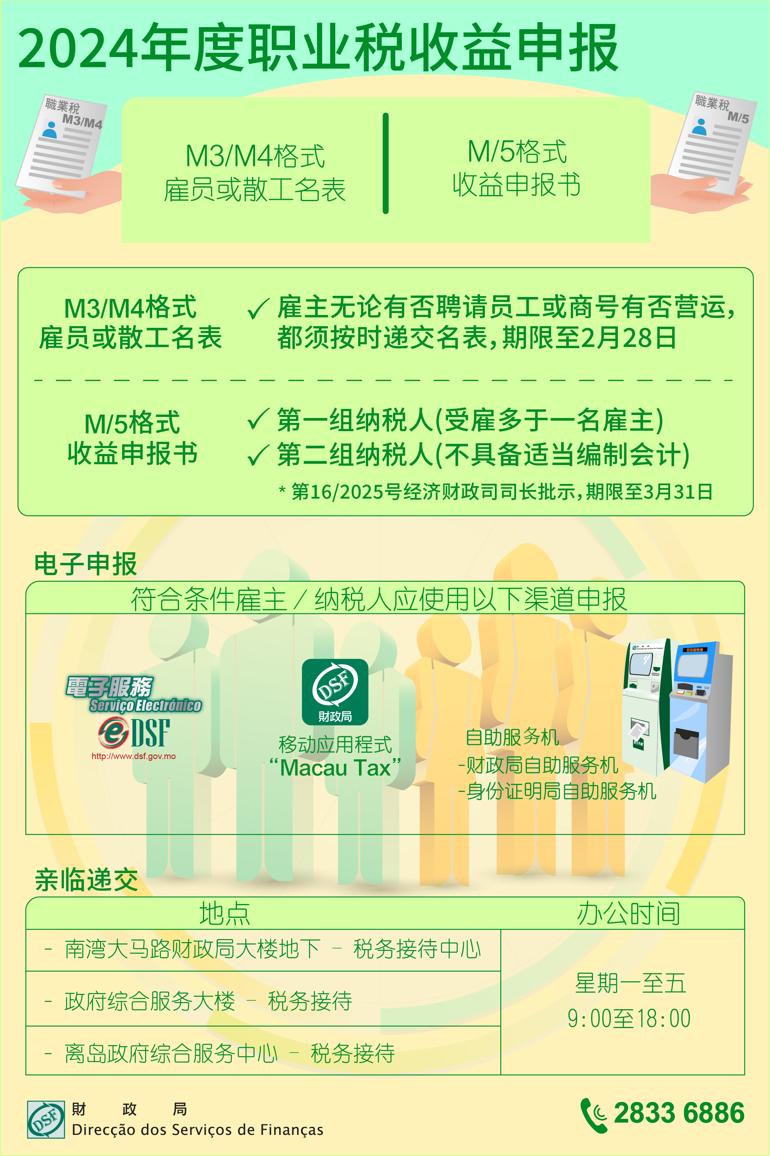 根据第2/78/M号法律核准之《职业税规章》第十三条之规定,2024年度职业税第一组M3/M4格式(雇员或散工名表)递交期限至2月28日;另根据第16/2025号经济财政司司长批示,倘收益从多于一位雇主处取得的职业税第一组纳税人,又或不具备适当编制会计的职业税第二组纳税人,递交2024年度职业税M/5式收益申报书的期限至3月31日。