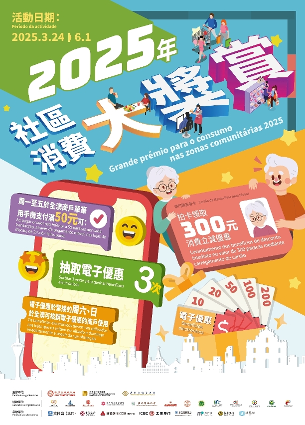 特区政府与商会、各承办单位现正全力筹备于3月24日推出“2025年社区消费大奬赏”大型促消费活动,是次活动设有“手机支付电子优惠”和“长者消费立减优惠”两部份。