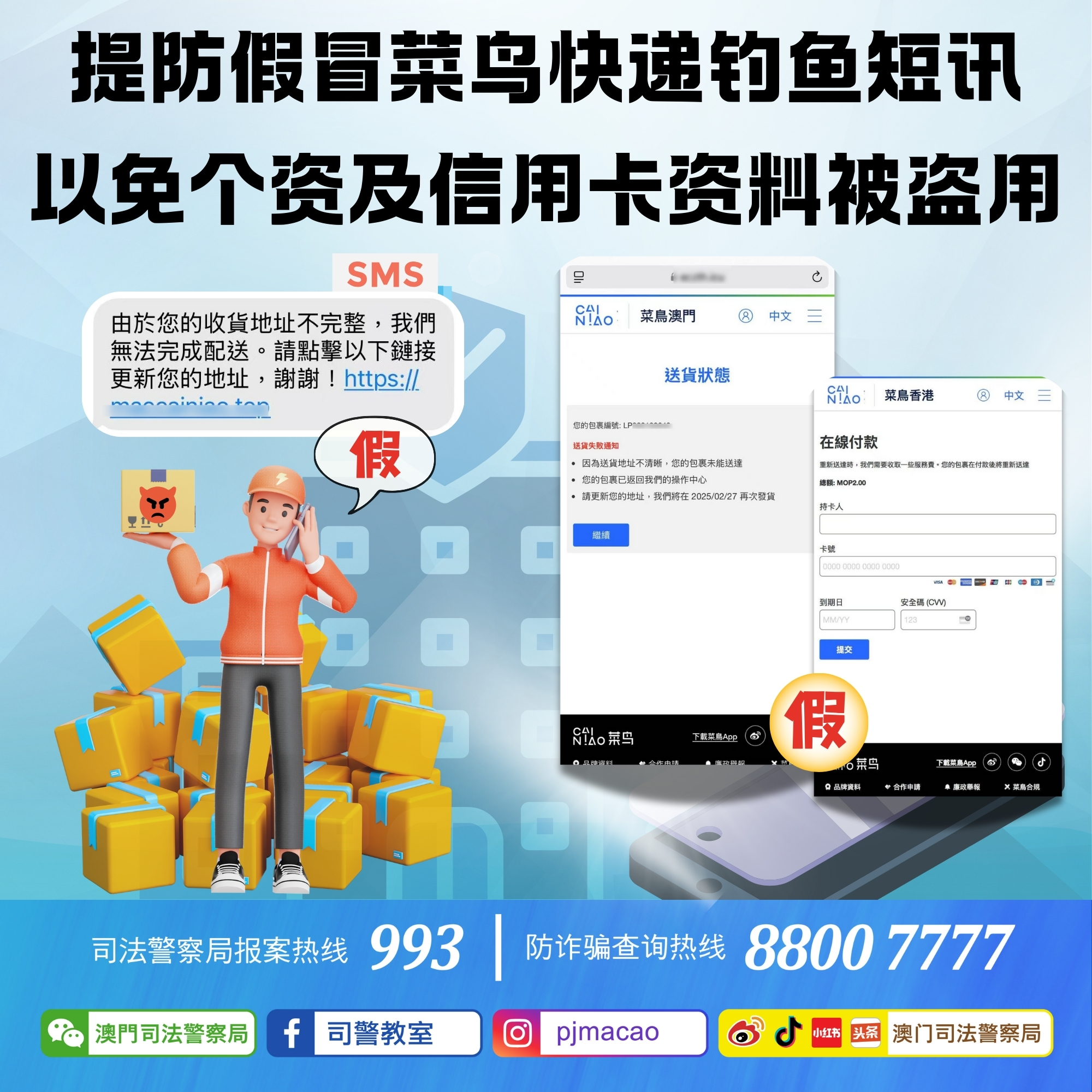 司警局近日接获多名市民举报,指收到假冒物流公司“菜鸟”发出的钓鱼短讯。短讯内容讹称用户的收货地址不完整,须点击短讯内附带的连结重新输入。