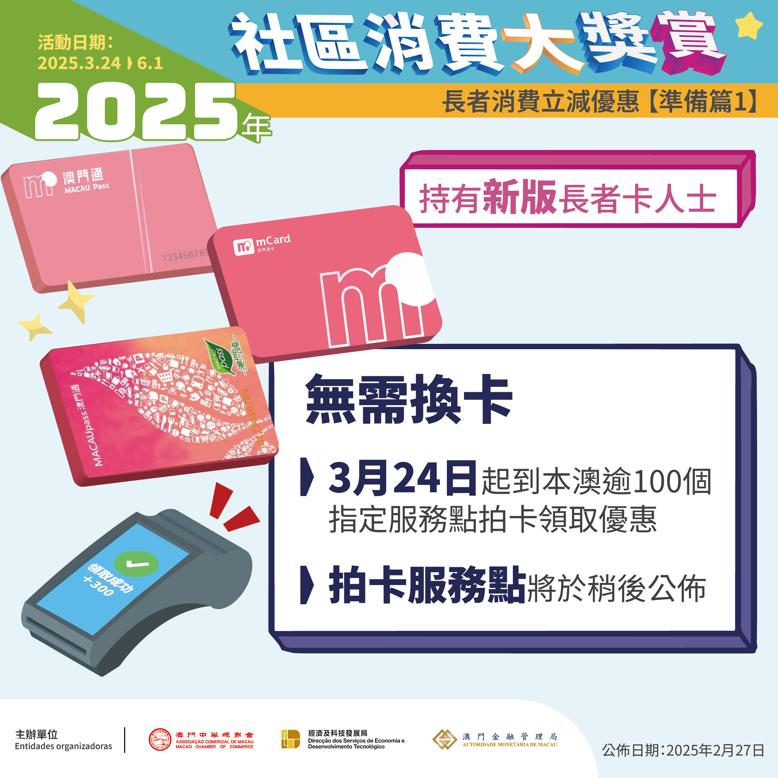 由特区政府与商会合办的“2025年社区消费大奬赏”大型促消费活动将于3月24日至6月1日期间进行。为关顾长者,是次活动在过往手机支付消费后抽取电子优惠的基础上,额外提供“长者消费立减优惠”,年满65岁的长者在活动期间可凭新版“澳门通长者卡”拍卡领取总额300元的消费立减优惠。