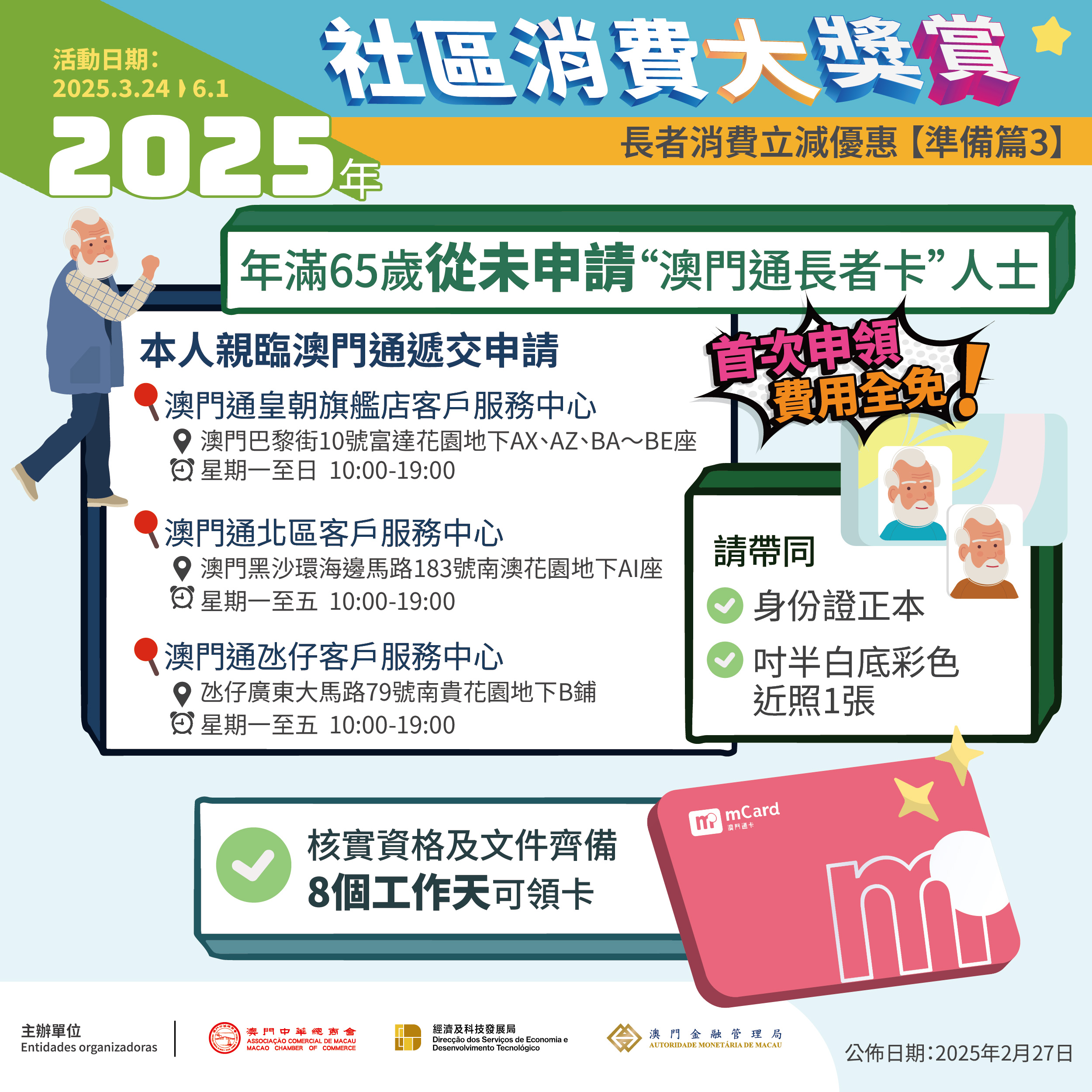 由于旧版“澳门通长者卡”所使用的晶片无法支援拍卡领取立减优惠,为便利长者领取立减优惠,经科局连同社工局协调社服机构和社团,从3月6日起至5月20日期间设置换卡服务点为长者提供辧理免费换卡手续。全澳逾60个换卡服务点已准备就绪,各服务点的地址及服务时间,可查阅活动专页 (http://www.macaospendingrewards.com)。