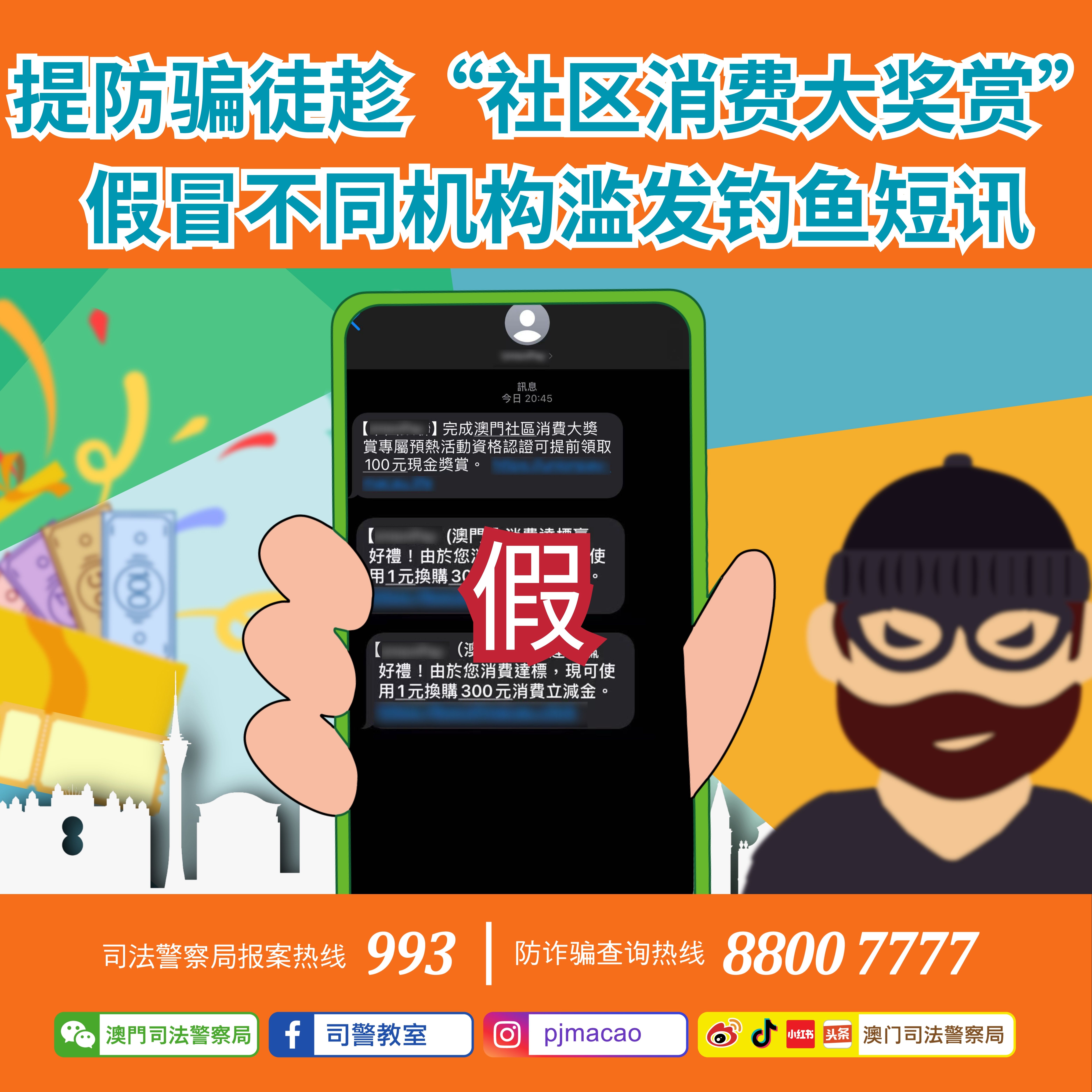近日司警局先后发现有骗徒假冒“中国银行”、“工商银行”、“银联”等金融及支付机构向市民发送钓鱼短讯,讹称市民符合资格以极低价换购超值消费优惠劵,诱骗市民点击短讯附带之钓鱼连结进入假冒网站,借此骗取市民个人及信用卡资料后以此进行未经授权之大额交易。鉴于为期10周的「2025年社区消费大奖赏」大型促消费活动即将于本月24日正式推出,而去年本澳同类消费奖赏活动期间,骗徒亦曾假冒主办方滥发钓鱼短讯进行诈骗,预计今年骗徒可能故技重施,因此市民务必提高警惕,谨慎防范。