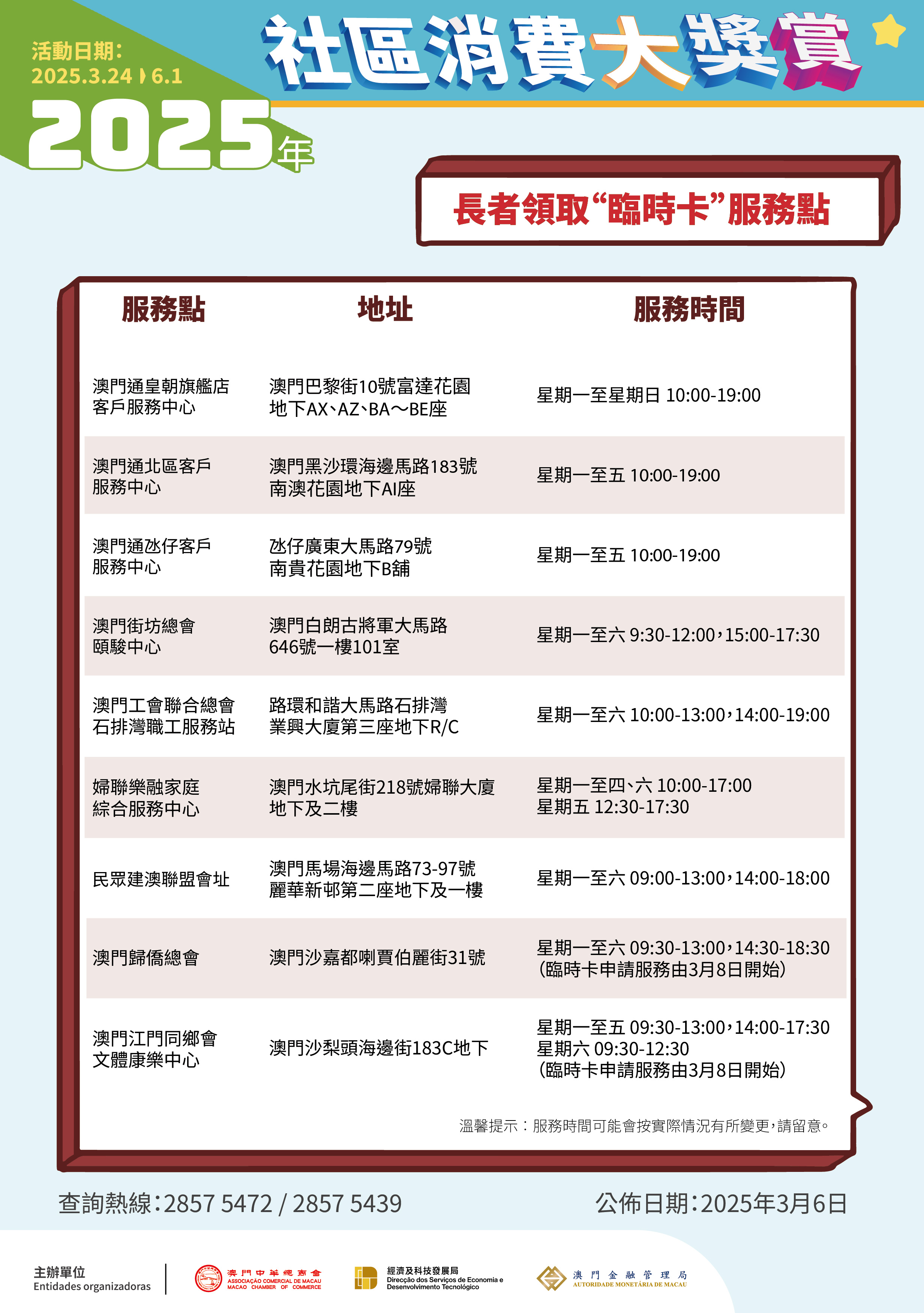 持有新版“长者卡”的市民,可于3月24日至6月1日“2025年社区消费大奬赏”活动期间前往全澳逾100个指定服务点拍卡领取“长者消费立减优惠”。