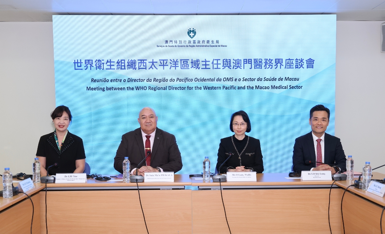 3月13日澳门特别行政区政府社会文化司司长柯岚、卫生局局长罗奕龙、社会文化司司长办公室顾问吕红及本澳医务界代表,与到访的世界卫生组织西太平洋区域主任赛亚·皮乌卡拉博士(Dr Saia Ma'u Piukala)、规划管理司执行主任刘岳博士举行座谈会,就加强澳门特别行政区政府与世界卫生组织(以下简称世卫)在公共医疗卫生领域的合作进行深入讨论。中华人民共和国外交部驻澳门特别行政区特派员公署综合部主任郭晓峰、中央人民政府驻澳门特别行政区联络办公室宣文部综合处副处长刘锐等亦出席了是次座谈会。