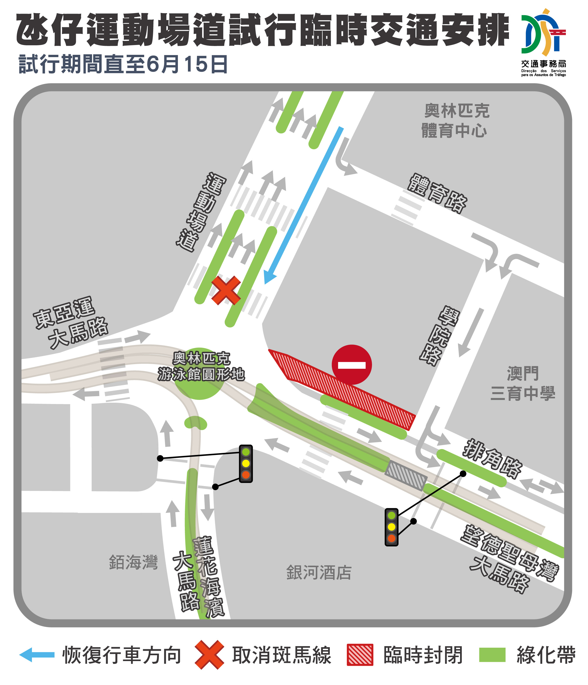 局方于2月16日至3月15日试行恢复运动场道双向交通安排,相关措施方便车辆由运动场道直接前往奥林匹克游泳馆圆形地(具体安排可查阅示意图),毋须再经学院路。根据车流数据显示,措施能有效分流区内前往路氹城区的车流,学院路的车流亦录得显着下降,而奥林匹克游泳馆圆形地的行车情况也基本保持畅通;巴士方面,102X、H3及N6路线改为直接由运动场道行经奥林匹克游泳馆圆形地前往莲花海滨大马路,相关改动可缩短行程时间,且不会影响停靠站点。因此,局方决定将相关措施延长至6月15日,以进一步监察措施成效和评估日后的恒常交通安排。