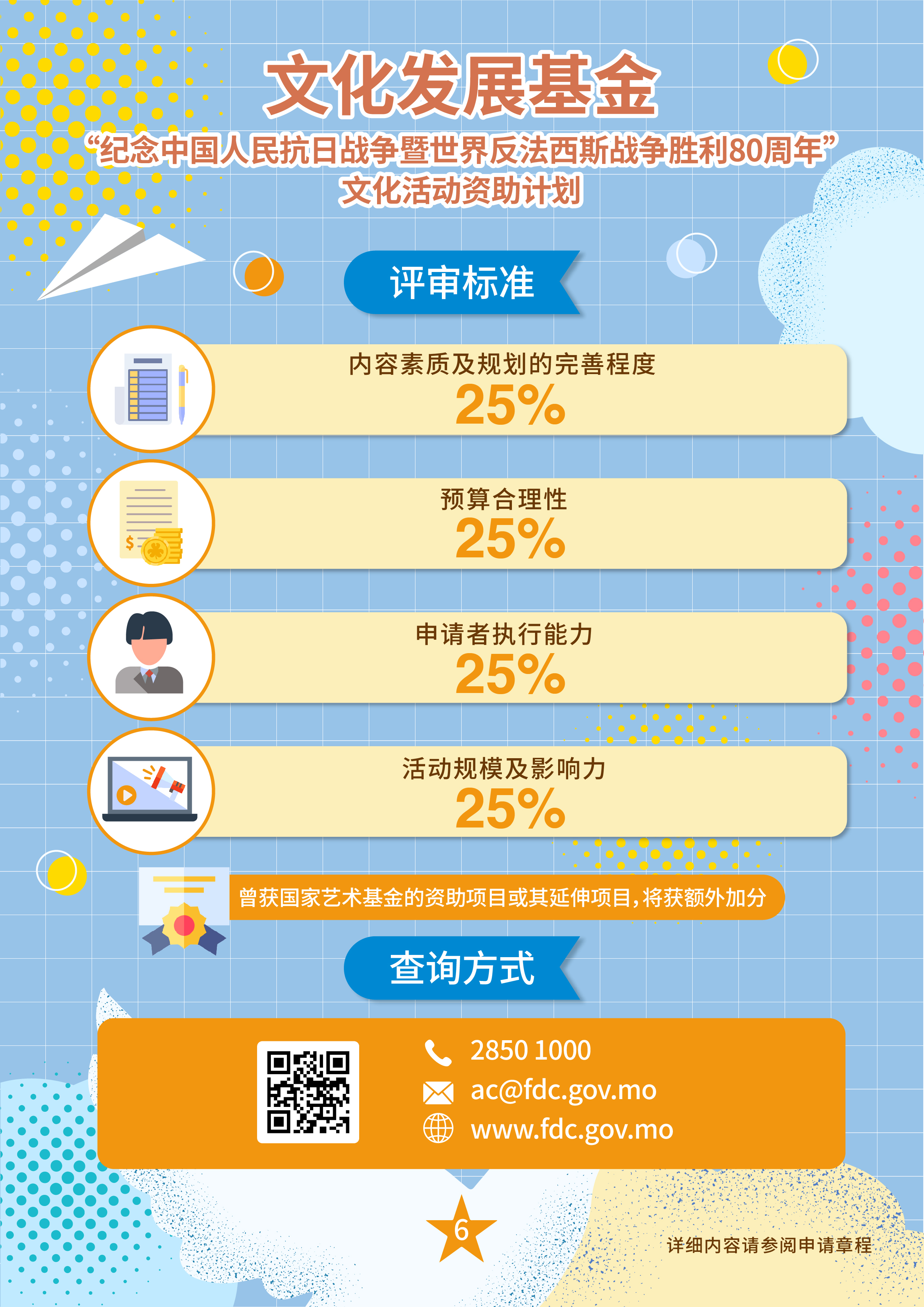 为详细介绍“纪念中国人民抗日战争暨世界反法西斯战争胜利80周年”文化活动资助计划的申请事宜及解答申请人问题,基金将于3月20日下午2时30分假诚丰商业中心7楼演讲厅(地址:澳门宋玉生广场322-362号)举行讲解会,有兴趣人士请于基金网站(www.fdc.gov.mo)报名,查询请致电2850 1000或电邮ac@fdc.gov.mo。