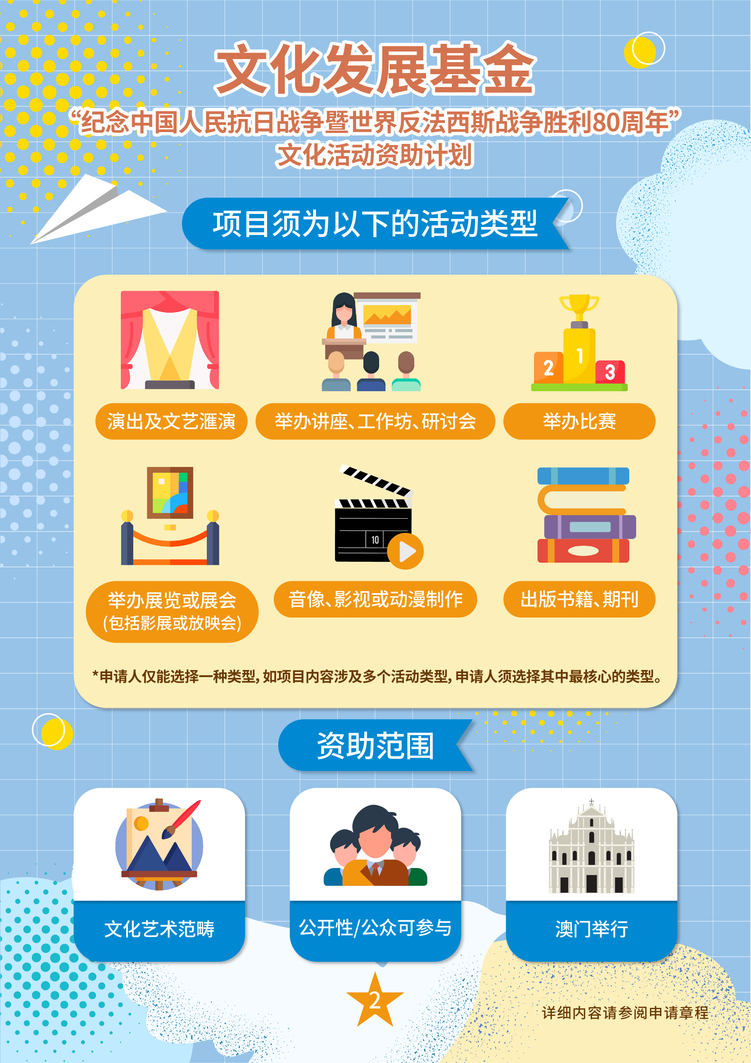 为纪念中国人民抗日战争暨世界反法西斯战争胜利80周年,文化发展基金推出“纪念中国人民抗日战争暨世界反法西斯战争胜利80周年”文化活动资助计划,支持本澳非牟利社团及财团开展各类文化活动,旨在弘扬抗战精神,凝聚爱国情怀,增强全澳市民对国家历史的认同感与自豪感。
