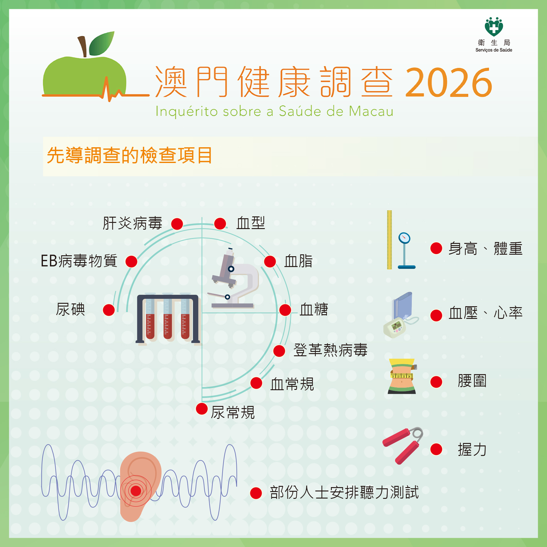 为贯彻落实《健康澳门蓝图》各项目标和指标,推动实现“幸福澳门"的愿景,卫生局积极筹备“澳门健康调查2026”。是次先导调查得到居民的支持及参与,被抽中的200个对象名额已顺利完成预约安排,四场先导调查将于3月22日起连续两个星期六及星期日分别在青洲卫生中心及下环卫生中心举行。为减少轮候时间,将安排受邀居民分批到达,卫生局提醒受邀居民只须按照短讯提示的时间和地点准时出席。