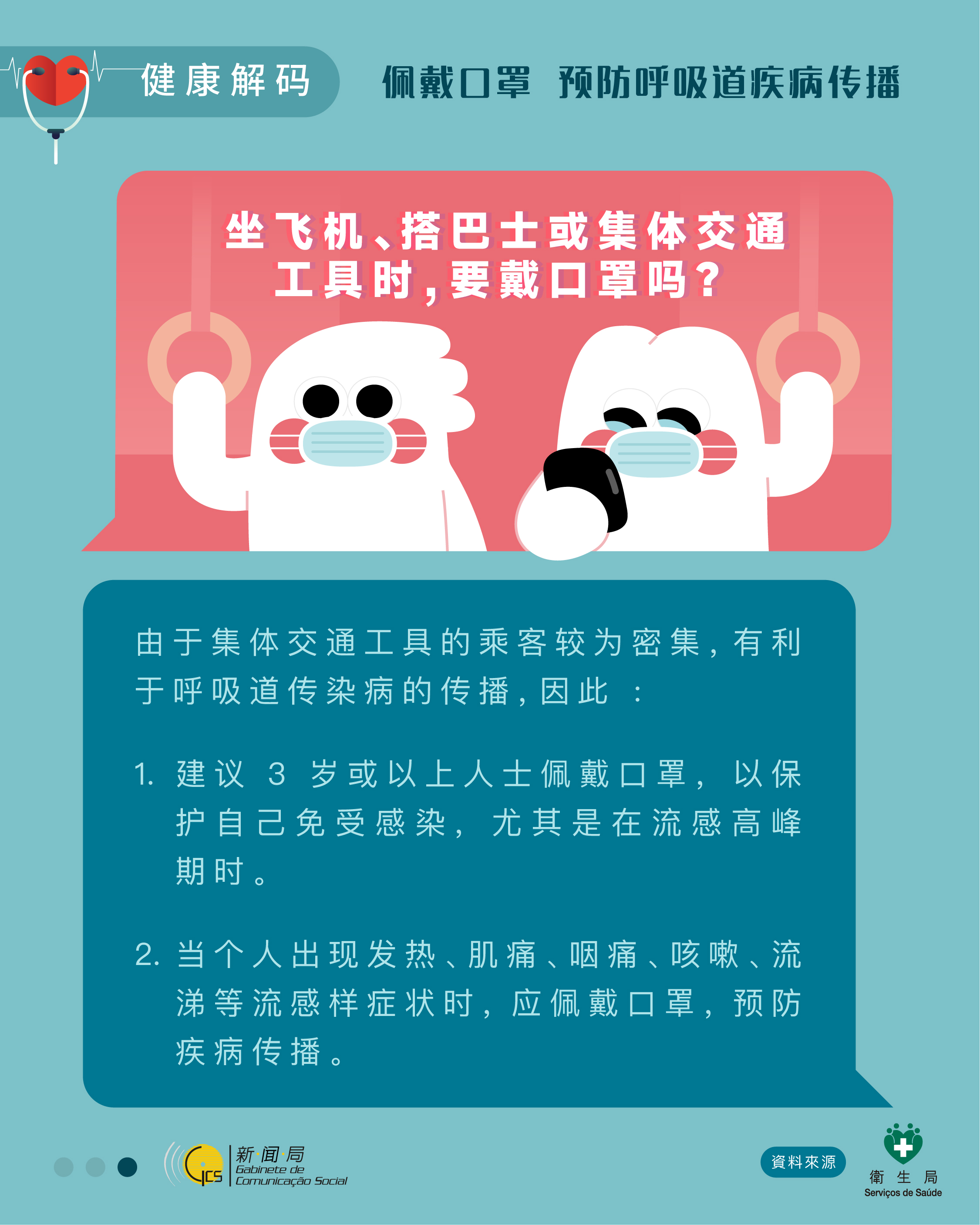 卫生局表示,春季是呼吸道传染病的好发季节,本澳现时新冠病毒持续活跃,呼吁居民加强注意防范,尤其高风险人士包括长者、患有严重慢性基础病、免疫力低下的人士应尽快完成接种JN.1新冠疫苗,感染后尽早就医使用抗病毒药物治疗,同时呼吁居民加强注意个人卫生,若有发烧、咳嗽等呼吸道症状时,身体抵抗力便会下降,外出时应佩戴口罩,以预防重迭感染其他呼吸道传染病,避免病情加重,并可减少疾病传播。