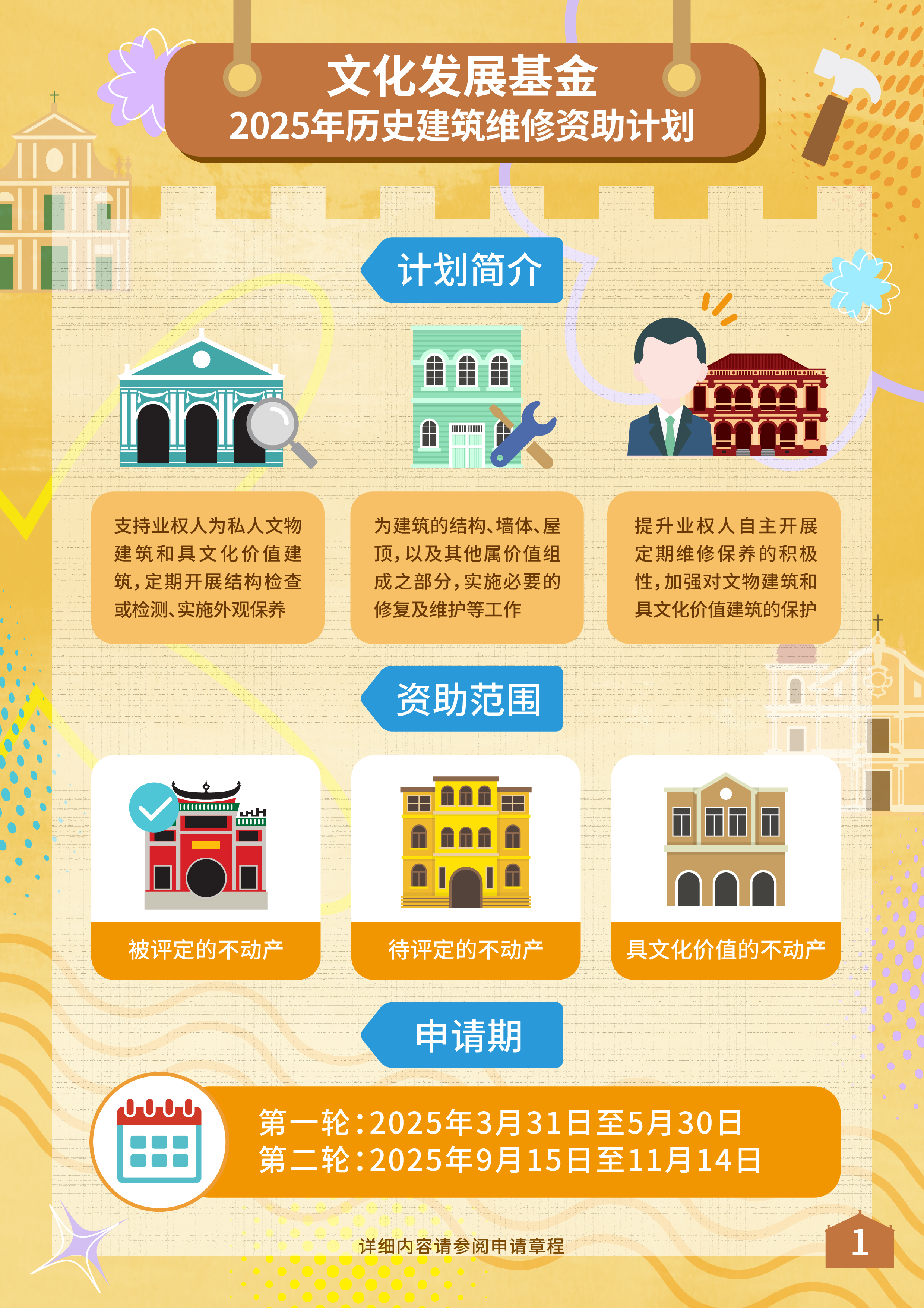 “历史建筑维修资助计划”今年将推出两轮申请,第一轮申请期由2025年3月31日至5月30日,第二轮申请期则由9月15日至11月14日。资助范围包括在申请期开始前尚未开展维修工程的被评定、待评定的不动产及具文化价值的不动产,并须由不动产的业权人或获授权人提交申请,如业权由多人拥有,可由任一共有人提交申请。