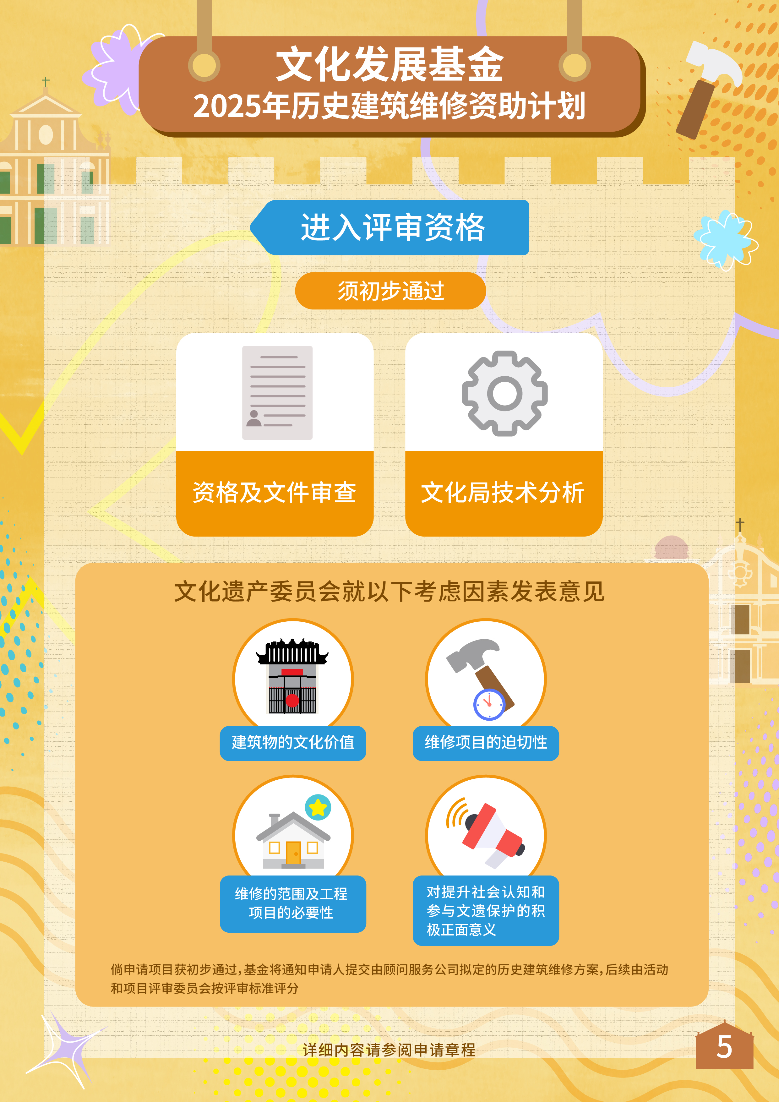 资助计划支持业权人定期对私人文物建筑和具文化价值建筑开展结构检查或检测、实施外观保养或翻新工程,以及因应检测结果实施必要的修复及维护等工作。文化发展基金将对申请项目作资格及文件审查,并送交文化局进行技术分析,接着会交由文化遗产委员会就该申请建筑物的文化价值、维修的迫切性和必要性,以及对提升社会认知和文遗保护的正面意义等因素发表意见。倘申请项目获初步通过,基金将通知申请人提交由顾问服务公司拟定的历史建筑维修方案,后续由基金的活动和项目评审委员会就申请项目的维修工程必要性、建筑物状态的预期改善效果、预算合理性作出评分。