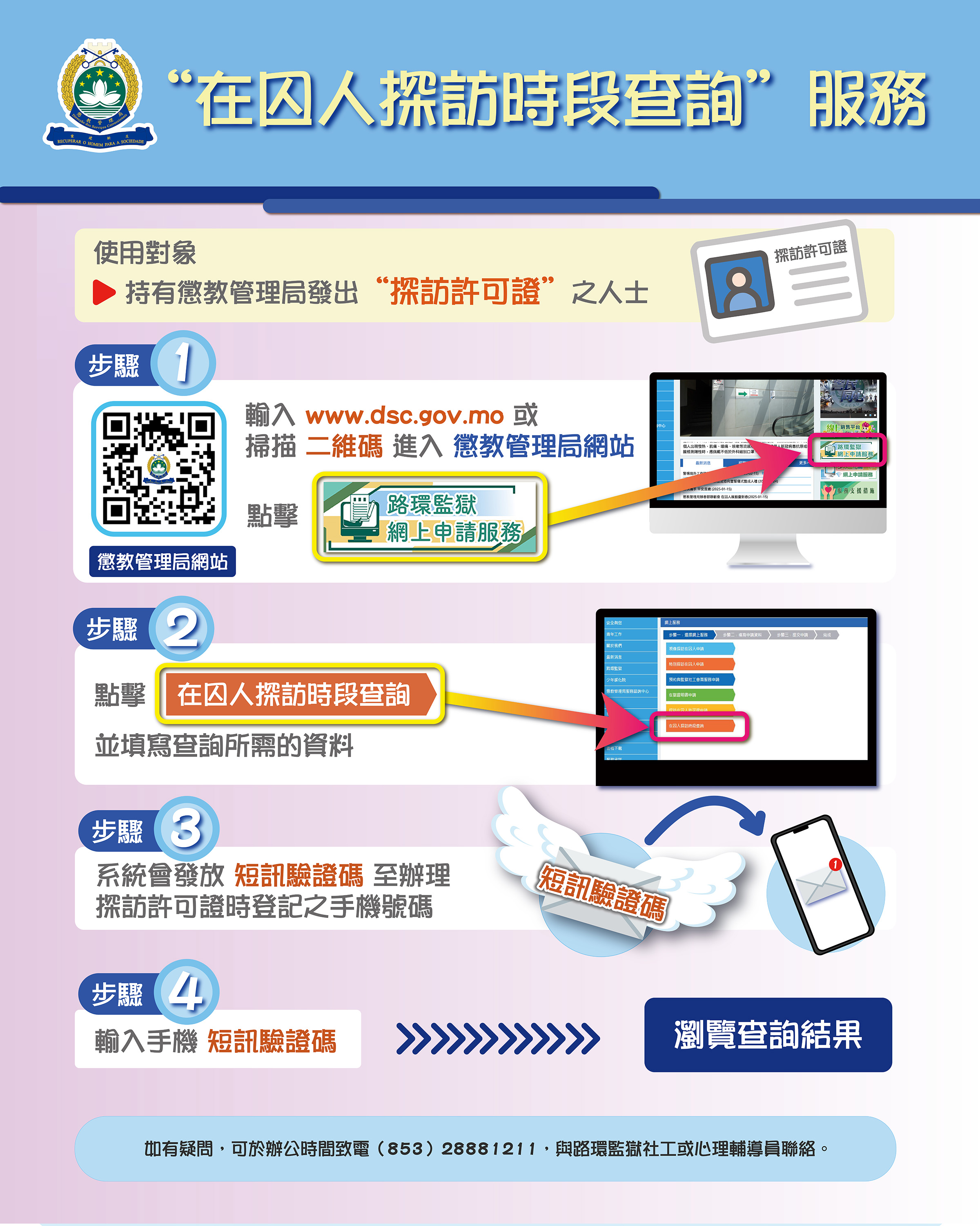 为配合特区政府电子政务的发展,持续优化各项便民服务,惩教管理局自2025年3月31日起,于网上服务平台新增在囚人探访时段之查询。持有探访许可证之人士,可登入惩教管理局路环监狱网上申请服务https://www.dsc.gov.mo/site/web_opinion.aspx,按提示输入及提供相关资料,查询相关在囚人探访时段。