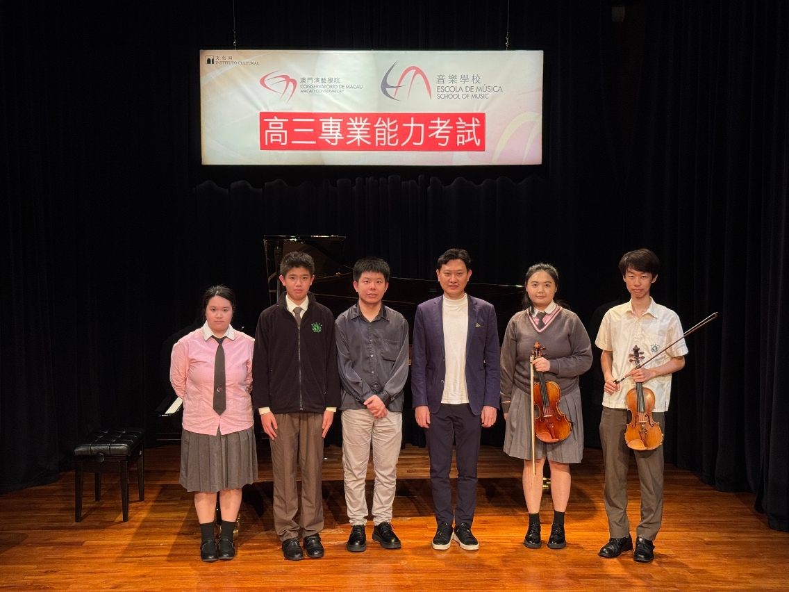 文化局辖下澳门演艺学院音乐学校早前(3月28日)为该校中学教育课程高三级学生举行专业能力考试,获联合办学机构中央音乐学院附属中等音乐学校(附中)委派小提琴家陈曦、钢琴家鹿尧来澳担任是次毕业试专家考官,与音乐学校专业导师们共同对高三学生的专业能力进行评定,两位专家考官对学生的表现给予高度评价,认为学生的整体水平均达到获高等艺术院校录取的专业水准。