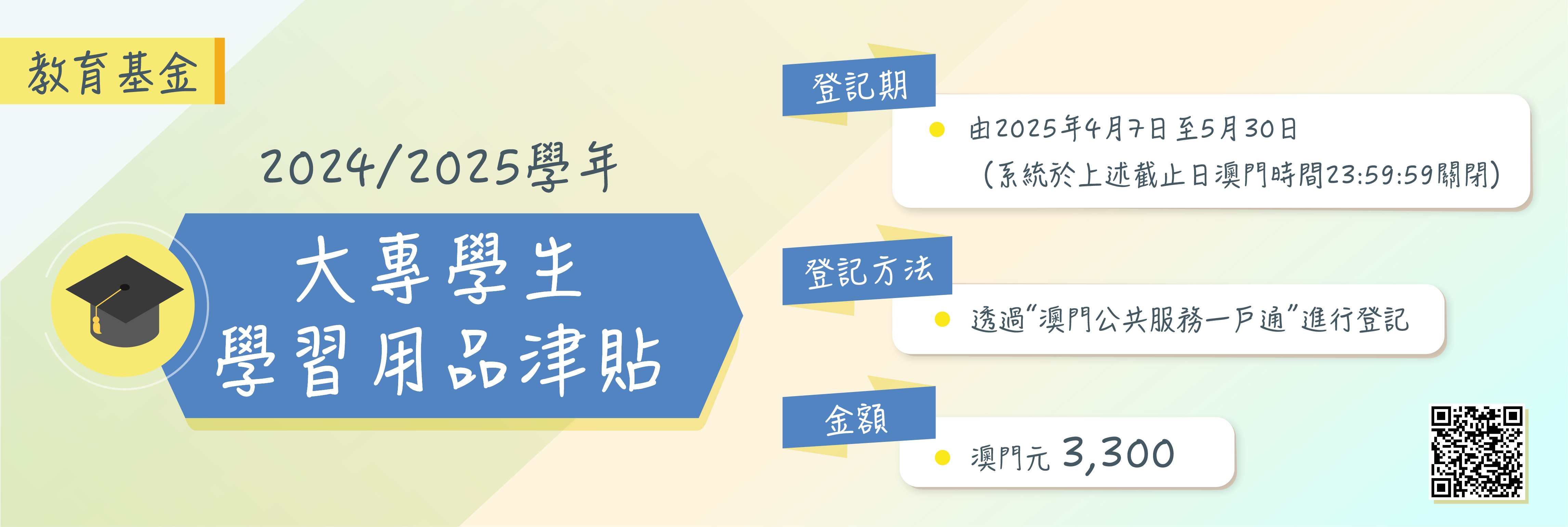 教育基金2024/2025学年大专学生学习用品津贴于202547日至530日接受登记,符合津贴发放条件的大专学生可获发澳门元三千三百元学习用品津贴。