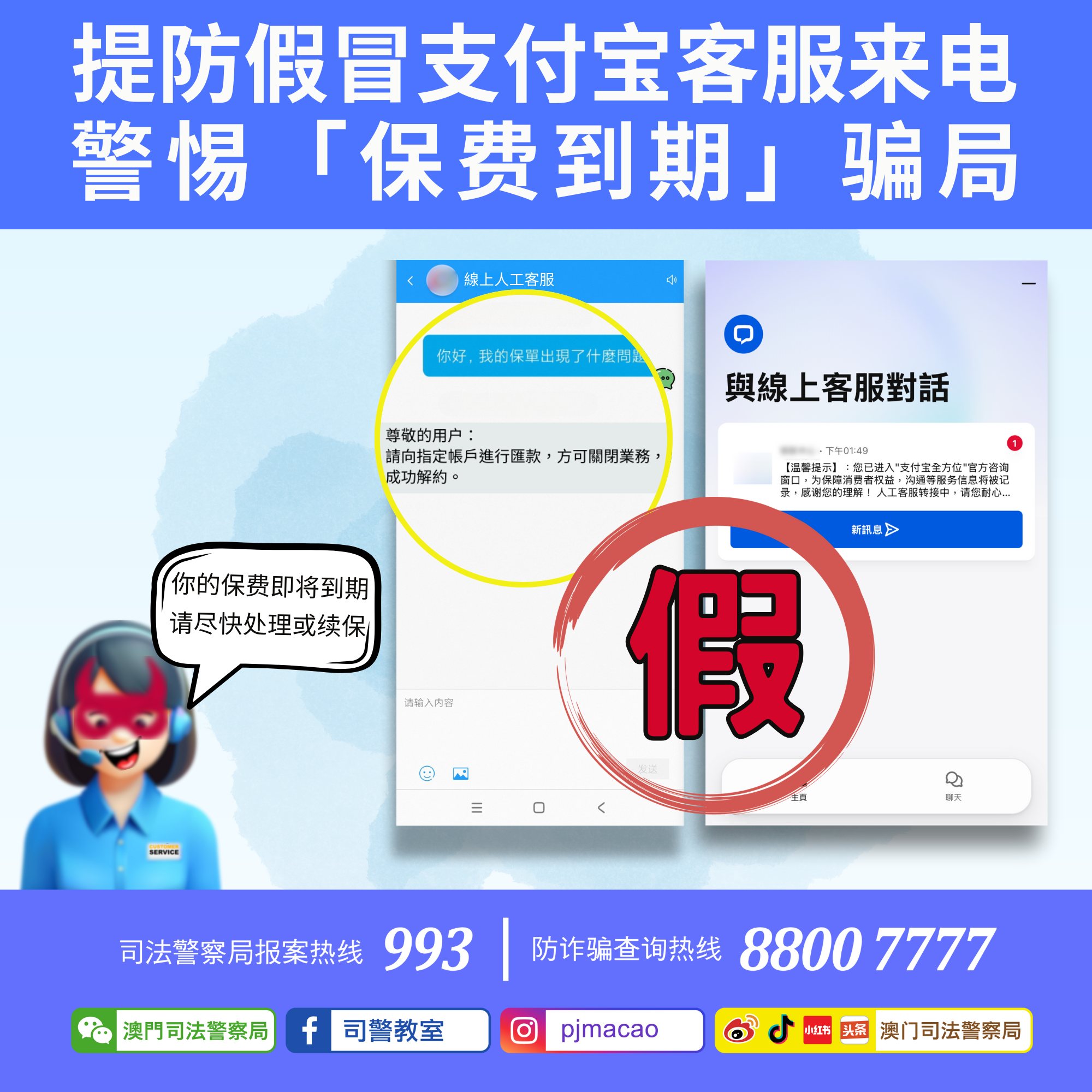 近日,司警局防诈骗查询热线接获多名市民通报,称收到冒充「支付宝客服人员」的来电。来电者以普通话表示,事主的帐户早前已开通并购买了「资金安全保险计划」,该保险计划即将到期,并将自动续保及从帐户中扣取大额保费。「客服人员」表示如需取消续保,事主必须按照指示登入一个所谓的金融机构网站,并与「线上人工客服」联络,并依指示进行转帐操作,方能解除上述保险计划。