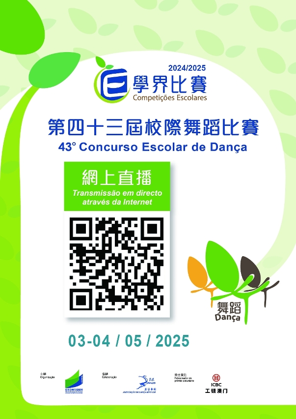为鼓励澳门舞蹈艺术的发展,促进各学校间的舞蹈文化交流,从而提高学界的舞蹈水平,使学生体会到相互合作的重要性,由教育及青年发展局主办、英姿舞园协办、中国工商银行(澳门)股份有限公司奖金赞助的“第四十三届校际舞蹈比赛”将于2025年5月3日及4日假澳门大学大学会堂举行。