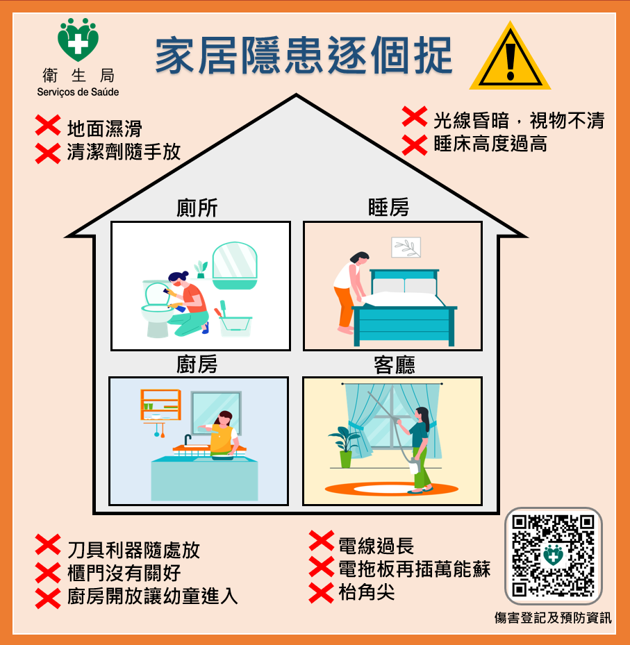 根据本澳地区伤害监测系统显示,本澳近年来伤害发生率最高的场所是居住场所,每年收到接近4,000宗家居伤害事故申报,伤者主要为婴幼儿及长者,成因为跌倒/跌落、被物体击伤及切割伤等为主,当中每年均有部分家居意外伤者需要手术或住院治疗,甚至有个别个案伤重死亡。