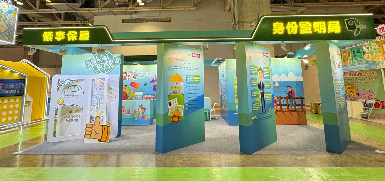 此外,身份证明局与外交公署合办的展位设于会场B 区,编号 B8,展位包含不同元素,包括有领事保护资讯展览、大型互动打卡装置,以及有奖问答游戏,奖品丰富,欢迎市民参与。