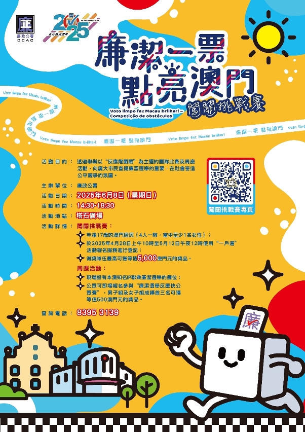 除了闯关挑战赛,活动当日亦设有多个周边活动,包括本澳知名IP联乘廉洁选举的摊位,以及其他以廉洁选举为主题的游戏摊位,完成游戏者可获限量版纪念品。周边活动毋须提前报名,欢迎市民到场参与。此外,亦可即场登记参加“廉洁选举反应快公众赛”,凭廉洁选举知识及反应力,点亮廉洁澳门,赢取奖品。活动章程可扫瞄二维码于活动专页内下载。查询请电8395 3139与廉政公署社区推广及公关处联络。