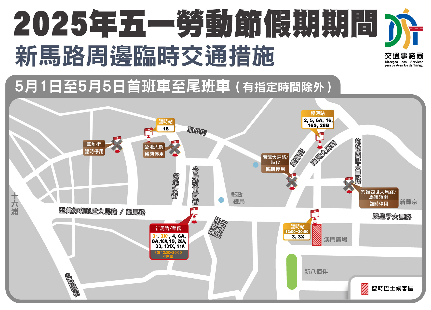 巴士方面,关闸广场东侧、新马路及周边区域、氹仔旧城区参考过往节假日分流方案实施临时措施;两间巴士公司因应假日增加服务班次,并于5月1至5日营运时节性路线3BX、17T、21AT、26AT及101X特班车(101XS)路线,以加快疏导乘客;配合有关安排,周边道路需实施临时交通管制措施。上述相关巴士路线临时调整详情,可参阅附表或浏览两巴网站(澳巴:www.tcm.com.mo、新福利:www.transmac.com.mo)。