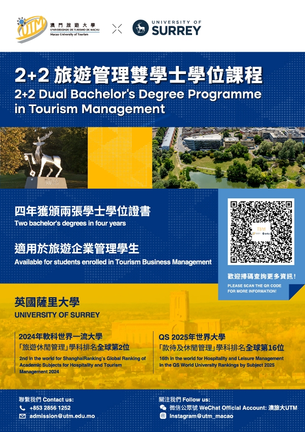 如欲了解更多详情,请浏览澳门旅游大学网页 https://www.utm.edu.mo/s/TCSurreyUG。