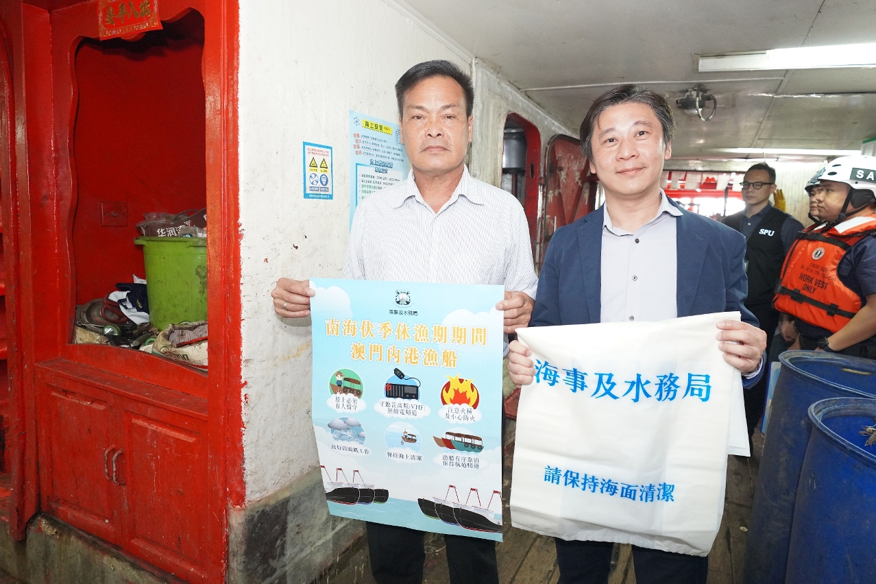 为期三个半月的南海休渔期,将于本年5月1日中午开始,至本年8月16日中午结束。随着内港一带锚泊的渔船数量增加,海事及水务局联同警察总局、海关、消防局、市政署、卫生局以及渔民团体代表登船拜访渔民,宣导休渔期期间防火、防风、防污、防盗和卫生等意识,呼吁渔民业界遵规守法,共同维护海上安全环境。
