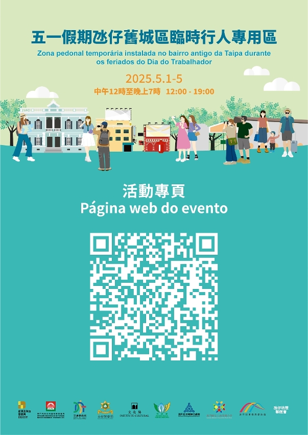 “五一假期氹仔旧城区临时行人专用区” 于5月1日至5日期间,每日中午12时至晚上7时在氹仔旧城区设置。政府跨部门和社团、商会的紧密合作下,启用至今运作顺畅,秩序良好,明(5)日为最后一天。