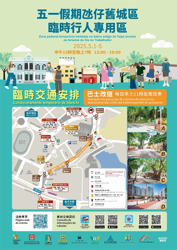 临时行人专用区于5月1日至5日每日中午12时至晚上7时,在氹仔旧城区设置。范围由飞能便度街与素啤古街交界(嘉模泳池巴士站),至告利雅施利华街与巴坡沙总督街交界之间的路段(路氹历史馆),当中包括兵房斜巷至嘉路士米耶马路部份路段。