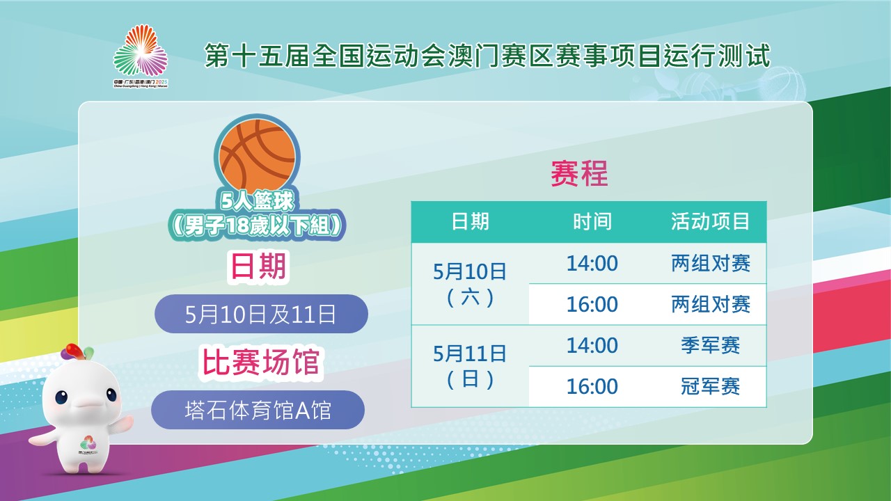 为了对赛事运行的各个环节进行检视和优化,十五运会及残特奥会澳门赛区筹备办公室将在5月及6月举行十五运会5个比赛的项目运行测试,当中,5人篮球(男子18岁以下组)将率先于本周末(5月10及11日)下午两时在塔石体育馆A馆举行,来自澳门、珠海、中山、江门的球队将抽签分成两组对赛,赛事将开放予市民及旅客入场观赏,提前感受全运会盛事的气氛。