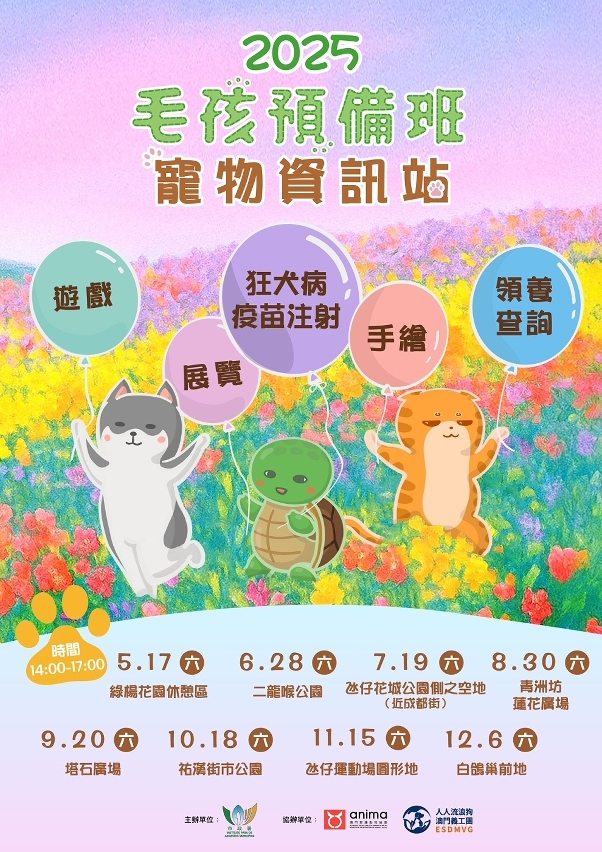 市政署联同动保团体于5月至12月期间,在全澳多区巡回举办“毛孩预备班─宠物资讯站”,设摊位游戏、手绘及展览活动,推广领养代替购买、尽责饲主义务等动物保护讯息。现场亦提供领养查询及狂犬病疫苗注射服务,欢迎市民到场参与并为狗只预约注射疫苗。