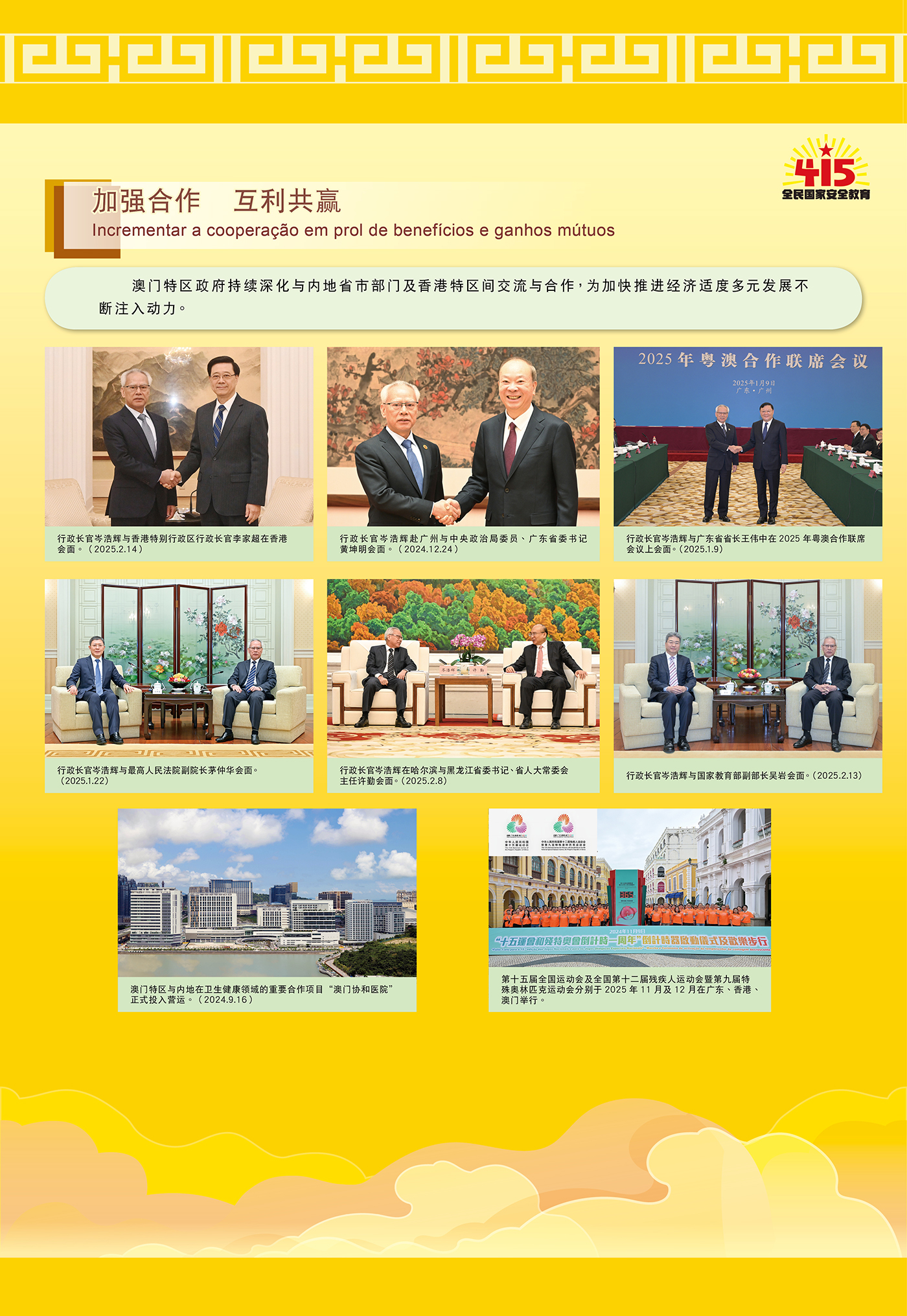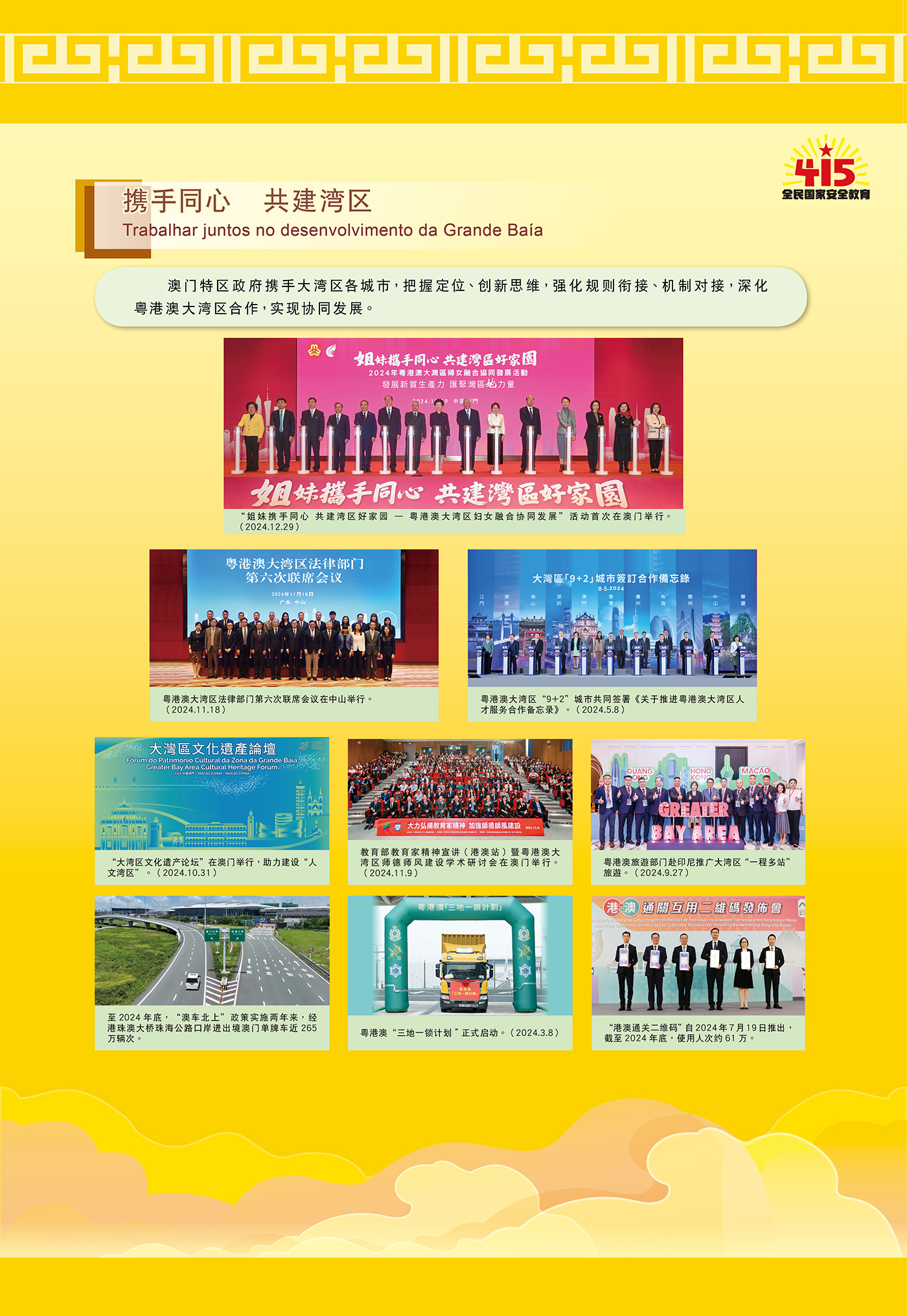 共建粤港澳大湾区方面,澳门特区携手大湾区各城市,把握定位、创新思维,强化规则衔接、机制对接,深化大湾区合作,实现协同发展。特区政府并持续深化与内地省市部门及香港特区之间的交流合作,实现互利共赢。与此同时,澳门特区高质量参与共建“一带一路”。