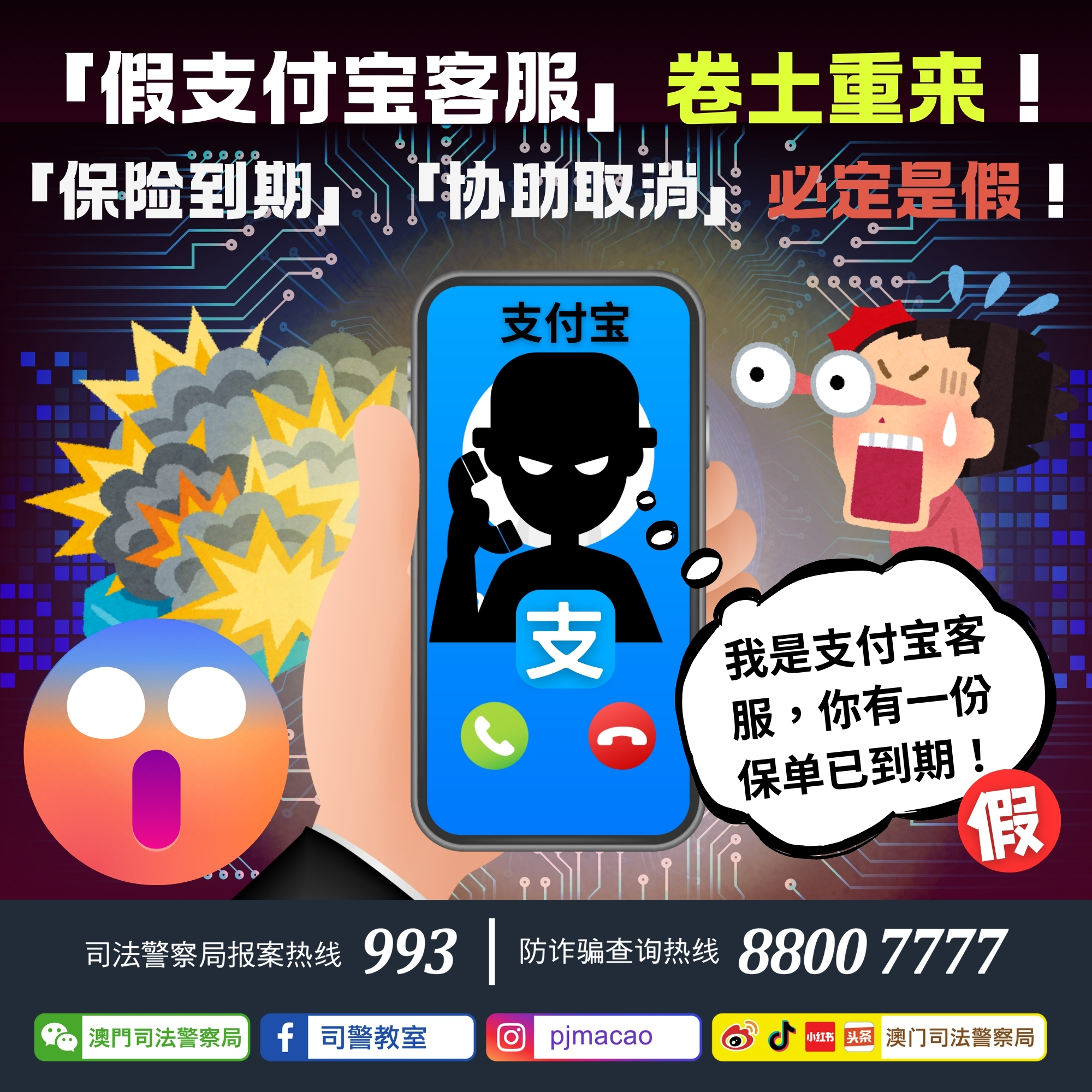 司法警察局昨日(5月12日)透过反诈程式及防诈骗查询热线,分别接获至少36名市民举报,报称收到冒充「支付宝」客服的诈骗电话。骗徒在来电中声称事主支付宝内的「资金安全保」即将到期,若不取消将被收取高额费用。随后,骗徒再冒充其他金融机构的「客服」联络事主,讹称协助取消保险手续,趁机诈骗金钱。