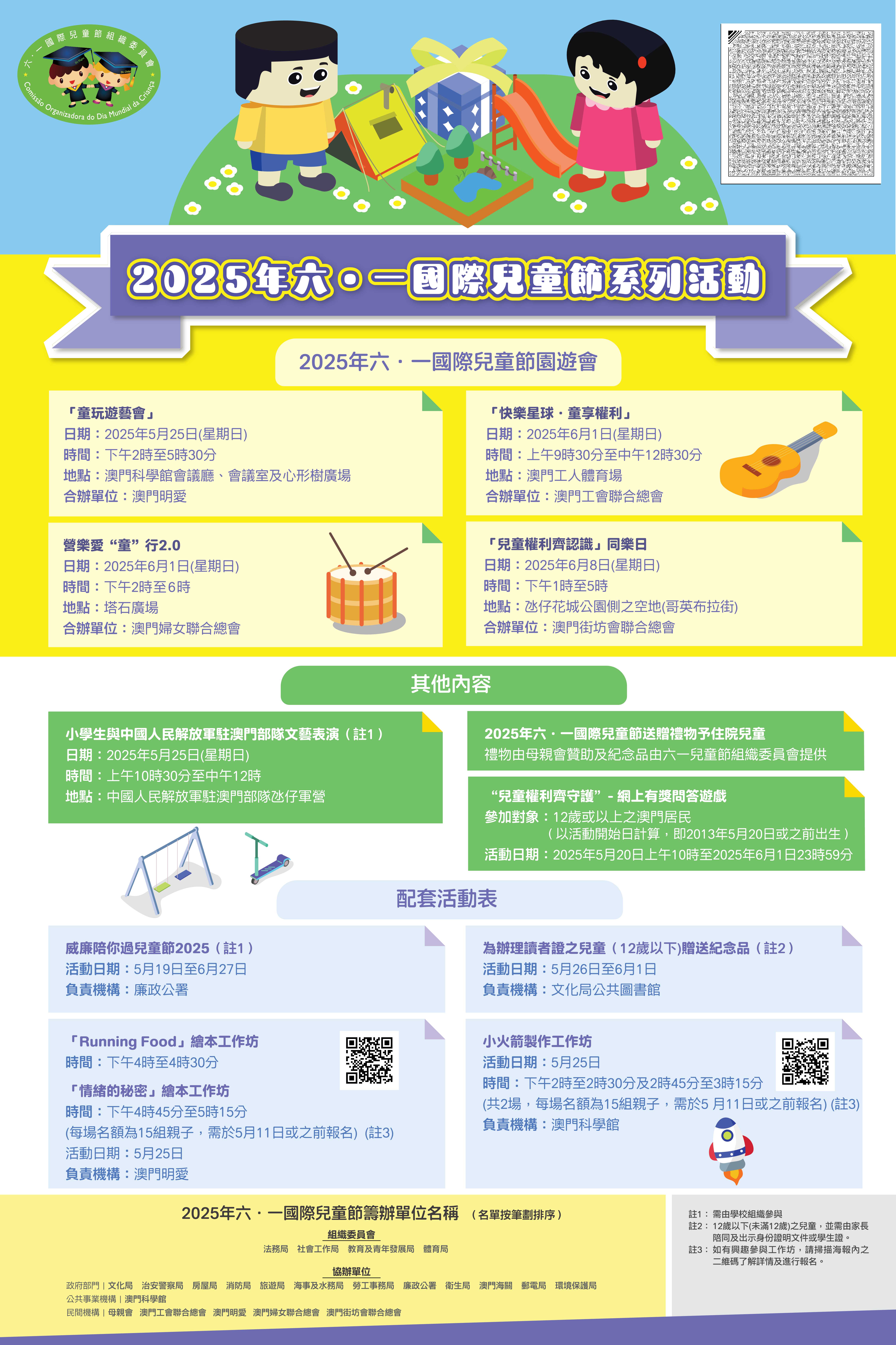 为庆祝6月1日国际儿童节,多个政府部门、公共事业机构及民间团体共同举办2025年“六.一国际儿童节”系列活动,本年以“儿童权利公约"中的生存权为主题,藉以唤起社会关注儿童权利和福祉,同时让市民一同感受节日气氛,欢度儿童节。