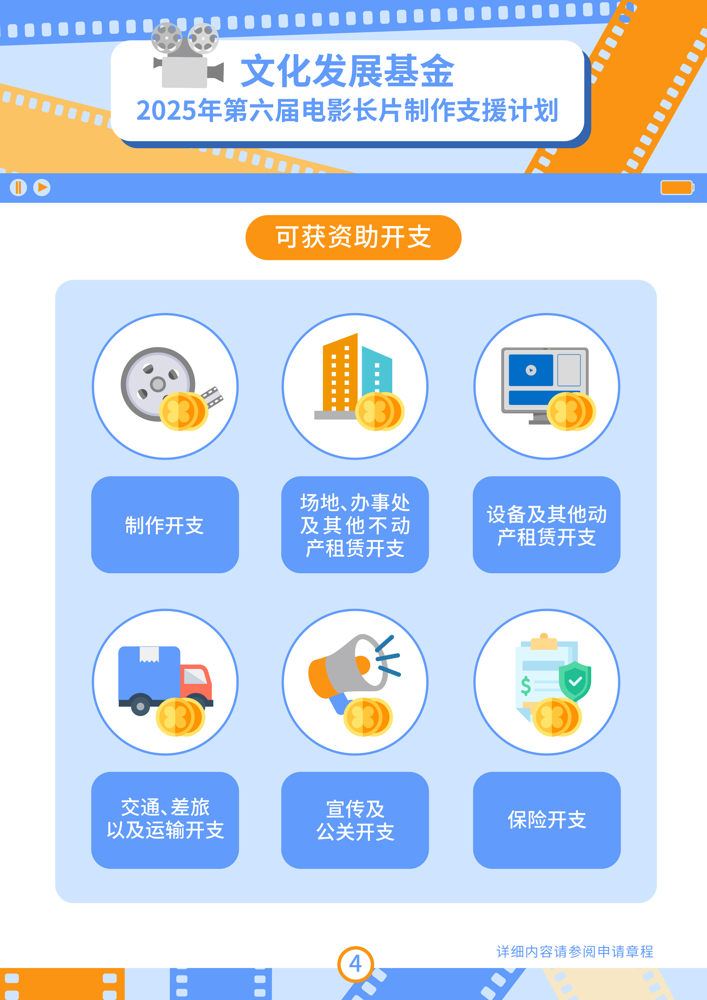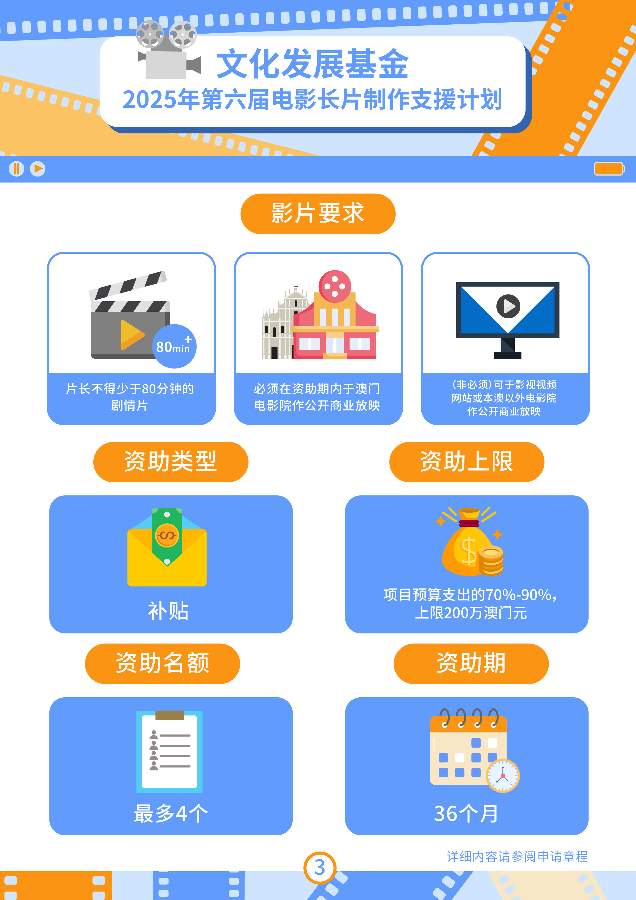 资助为补贴形式,资助期为36个月,获选名额最多4个,补贴金额上限为申请项目预算支出的70%至90%,且不超过200万澳门元,用作电影长片的制作及宣传推广费用。