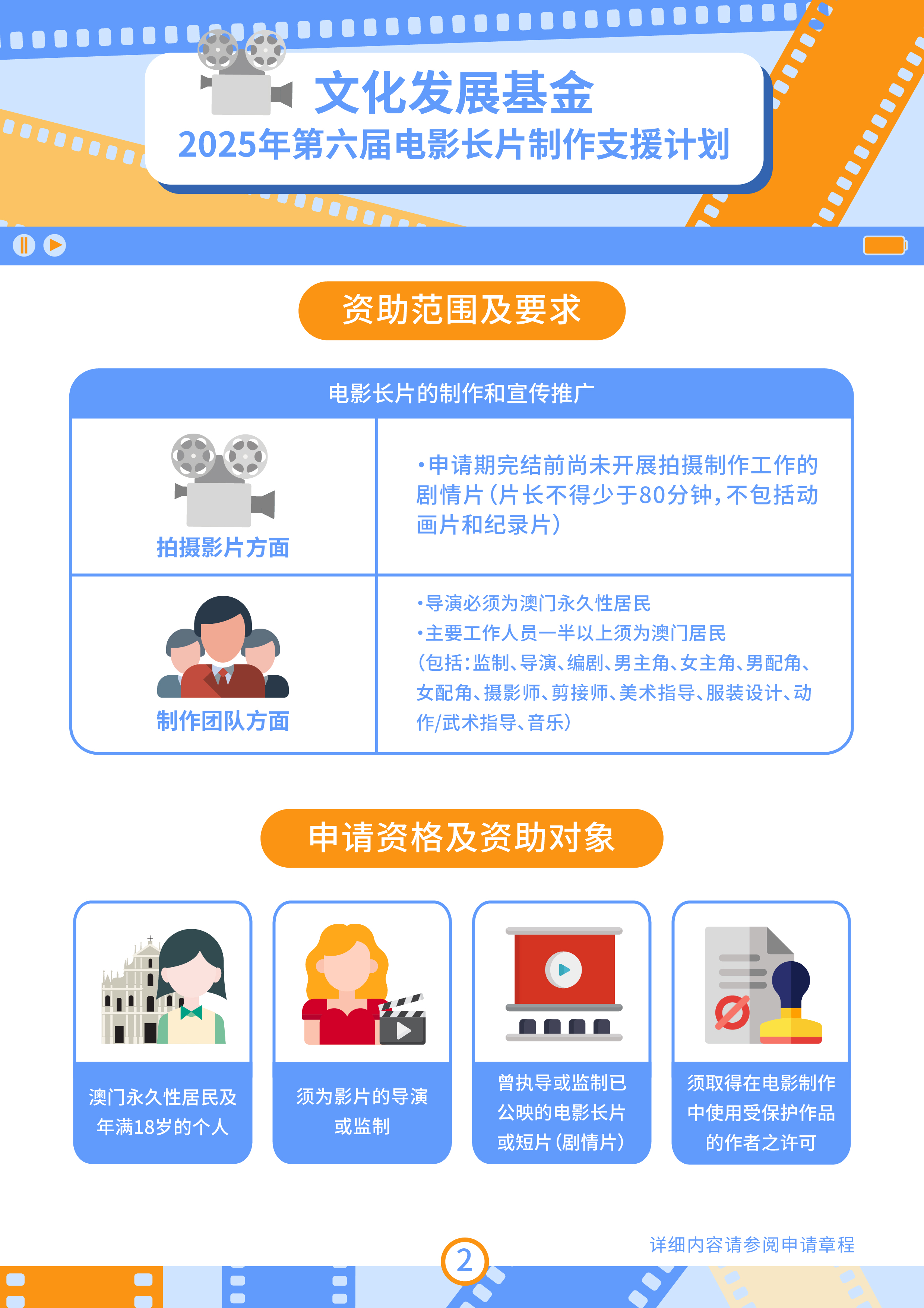 文化发展基金将于5月19日至7月18日接受“第六届电影长片制作支援计划”申请,持续为本地电影主创人员提供资金补助与专业意见支援,以提升澳门影视业界的专业制作能力。