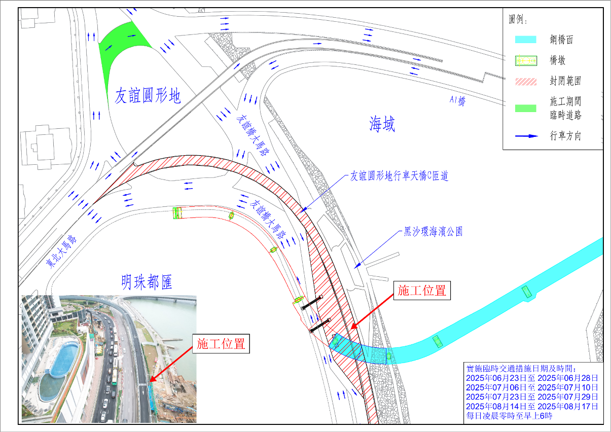 为配合友谊圆形地行车天桥第二期建造工程横跨友谊桥大马路上方一段的桥面吊装、防撞栏及相关配套设施安装、临时支撑及棚架拆除等工作,为保障行车安全,经跨部门协调,友谊桥大马路一带将于2025年5月25日至8月23日,每日凌晨零时至上午6时实施以下临时交通改道措施: