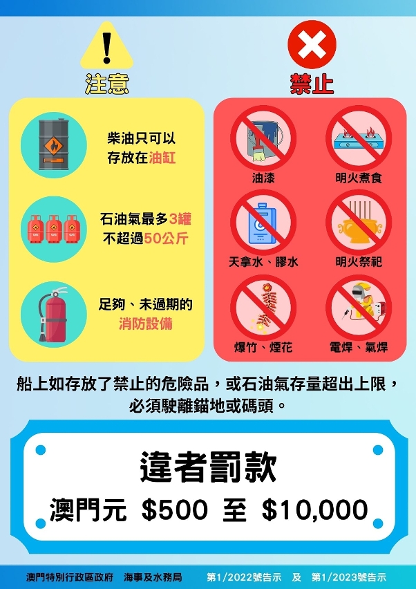 海事及水务局重申,灾害应防范于未然,海上安全攸关生命财产,渔民应提高警觉,严格遵守内港的渔船停泊规范,包括每排船只数量上限、易燃易爆品存量限制、严禁明火活动、落实电子申报及安排船员留守等,渔民如需在渔船上进行明火祭祀,需事先透过渔民团体向海事及水务局申请,海事及水务局会在渔船祭祀期间加强海上安全巡查。海上环境清洁需全社会共同维护,海事及水务局呼吁渔民保持锚地环境清洁,妥善处理垃圾和油污。