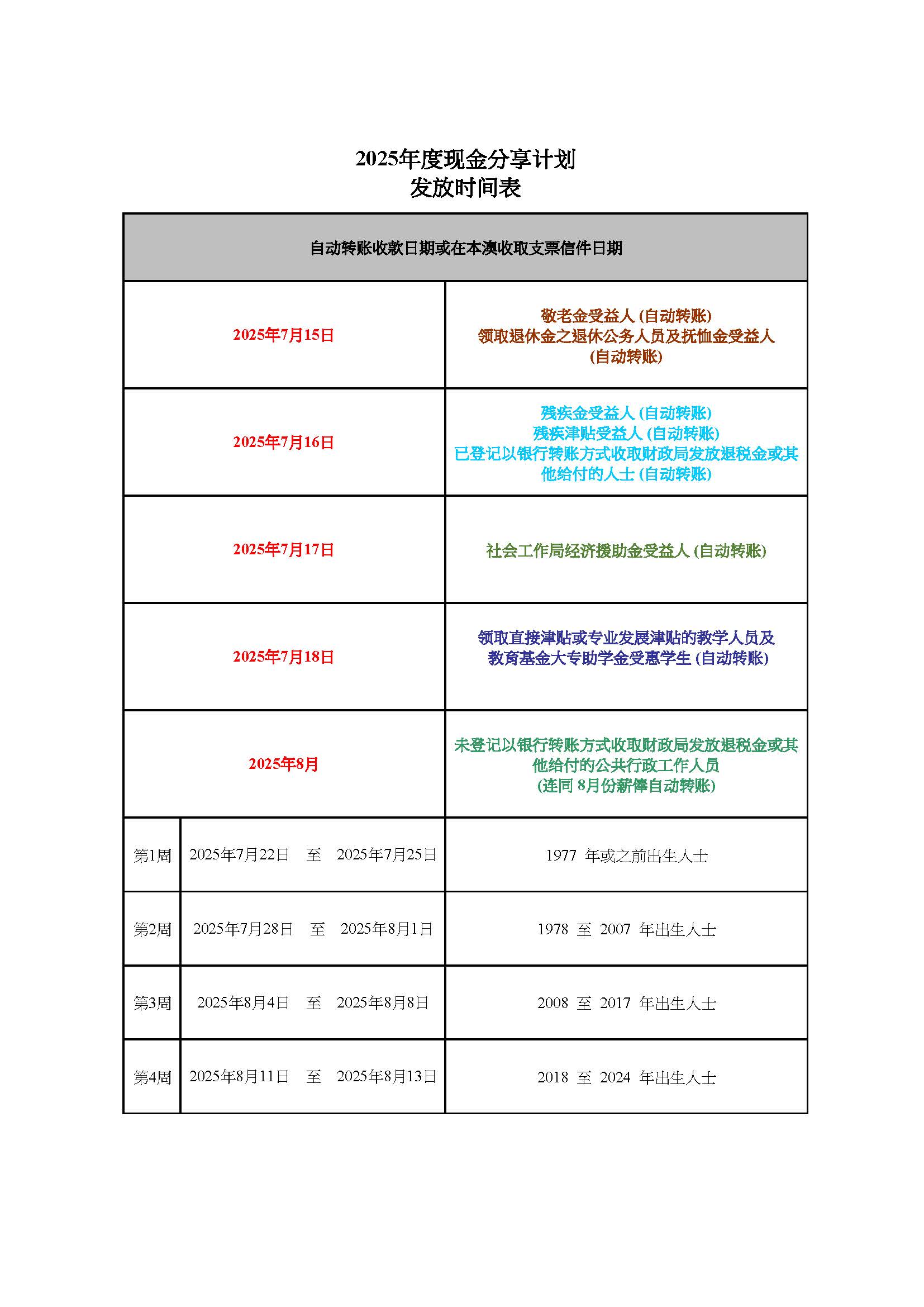 经听取社会的意见,并参考第7/2017号法律《非强制性中央公积金制度》关于发放预算盈余特别分配的规定,特区政府制定《2025年度现金分享计划》行政法规,对2025年度的现金分享的发放资格及声请手续作出规范。