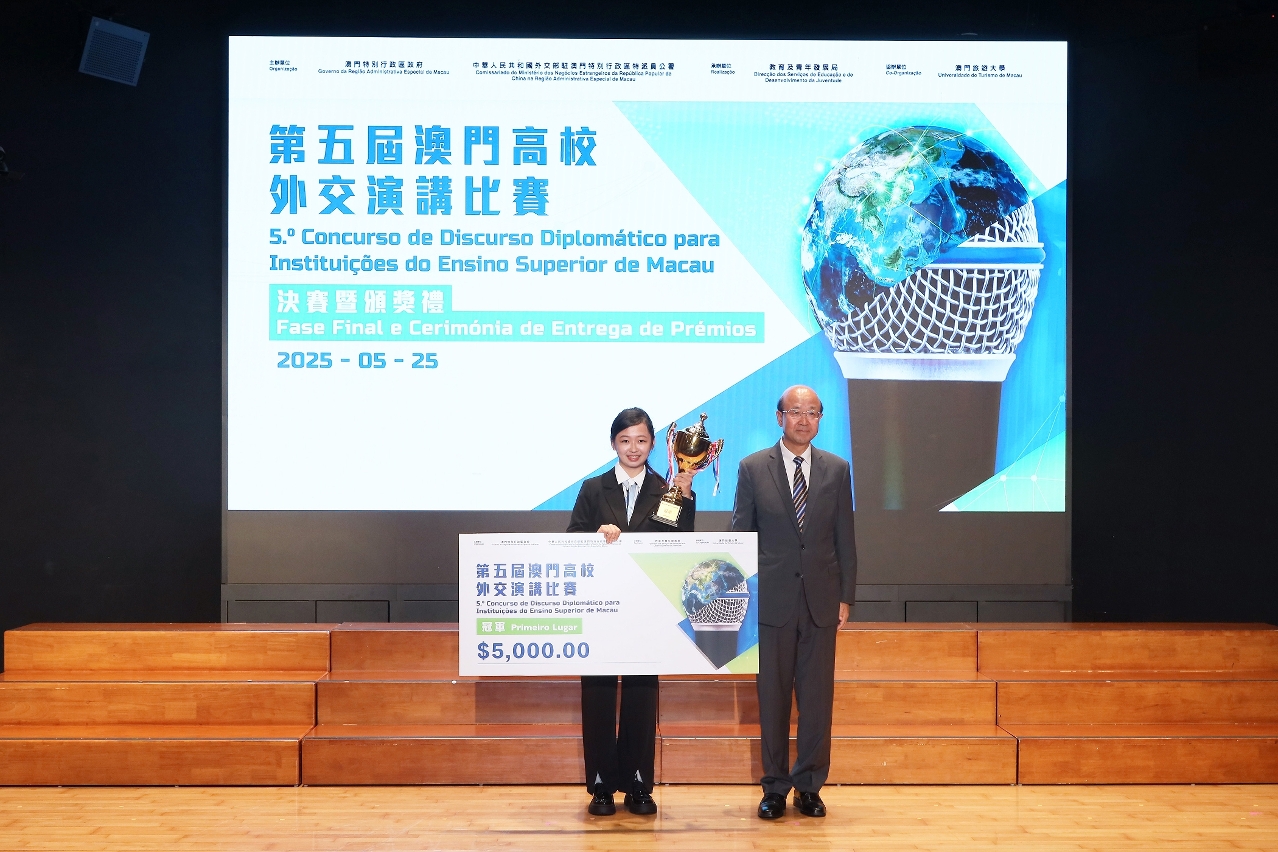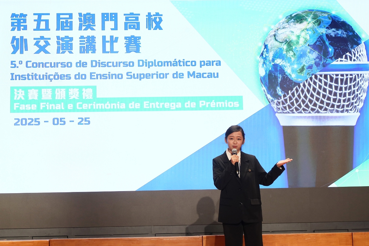 澳大社会科学学院、马万祺罗柏心书院学生陈若晴以题为“新光绽彩:在国际舞台中书写中国式答案”作出演讲,分享了她在阿塞拜疆、东帝汶等地的所见所闻,以中国援建光伏电站、澳门援建东帝汶妇幼保健中心等实例,生动展现澳门在“一国两制”优势下作为中西文化交融桥梁的独特魅力。她强调普通民众在文化与科技领域的“星火之光”,为推动人类命运共同体建设注入活力。凭藉独到的国际视野与真挚的个人经历,她的演讲展现了澳门青年的家国情怀与全球视野,深刻传达了澳门在国家对外开放战略中的重要角色,阐释中国特色大国外交的“携扶之光、互助之光、星火之光”,最终获得冠军殊荣。