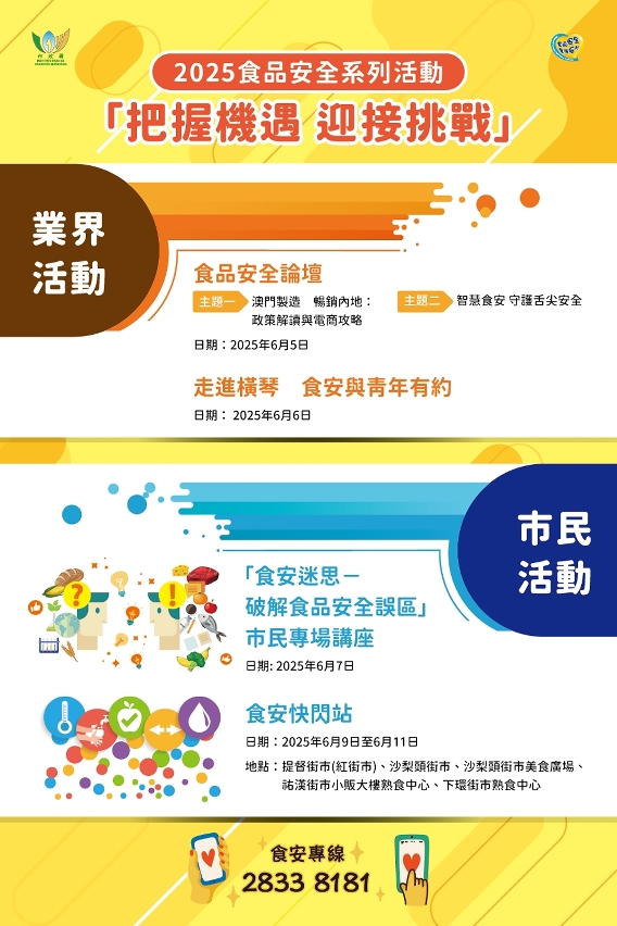 市政署诚邀业界、市民参与系列食安活动,共同提升澳门食安水平、促进产业进一步发展。如对活动有任何查询,可于办公时间致电食安专线2833 8181查询。