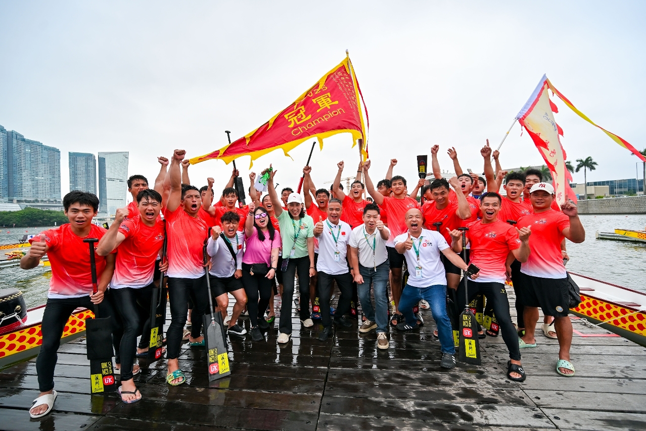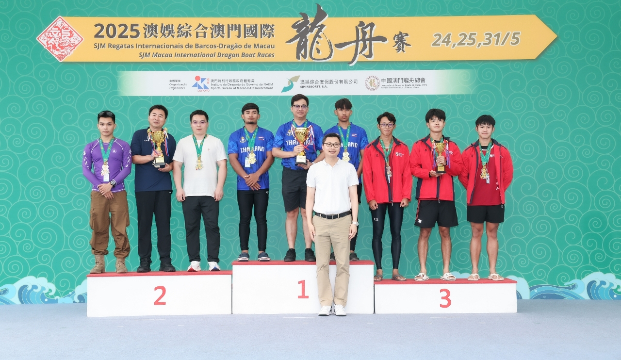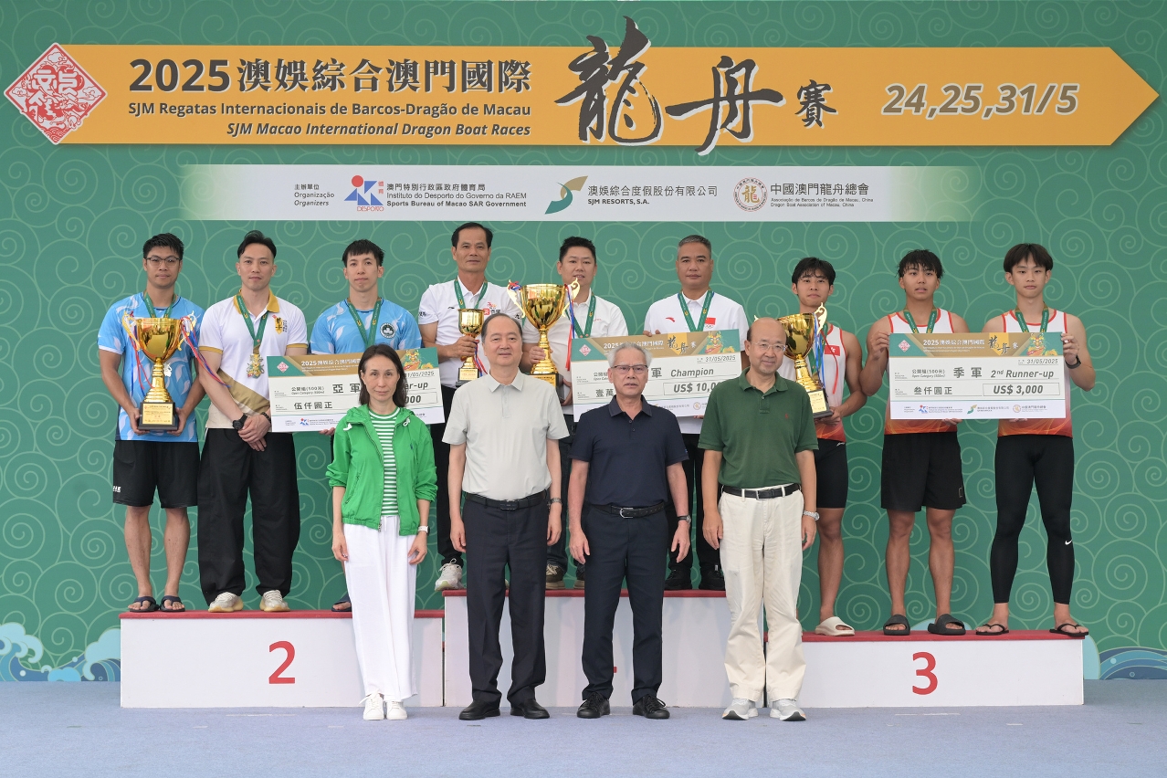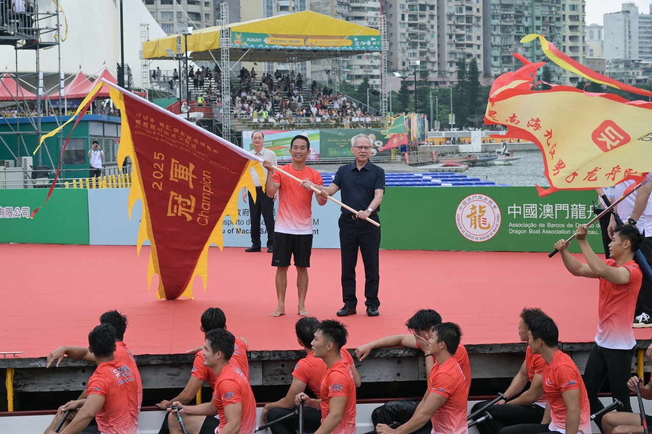 由体育局、澳娱综合度假股份有限公司(“澳娱综合”)及中国澳门龙舟总会主办,市政署及行政公职局协办的“2025澳娱综合澳门国际龙舟赛”,今(31)日端午节正日于南湾湖水上活动中心进行压轴的赛事。最终中国南海九江再度卫冕澳门国际龙舟邀请赛标准龙公开组(500米)及女子组(500米)冠军,并刷新两组赛事纪录;大学生邀请赛标准龙公开组(500米)由泰国国家体育大学夺得。行政长官岑浩辉出席活动观赏龙舟赛事,并主持点睛仪式及颁奖。