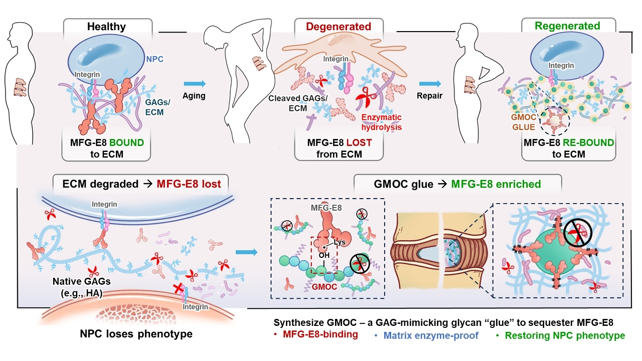 随着年岁增长,椎间盘组织退变可引发常见的慢性腰背痛、下肢活动受限等症状,严重影响生活品质。然而,现有临床治疗手段或仅能暂缓疼痛,或手术后较易复发。澳大研究团队通过分析临床病理标本与数据库,首次发现疾病的发展伴随着一类名为MFG-E8的蛋白流失,而该蛋白对于髓核细胞的健康至关重要。进一步分析发现,该蛋白流失的原因是由于椎间盘内部称为“髓核”组织中的糖苷内切酶不断增加,如同剪刀一样切碎原有组织中的糖胺聚糖,而这些糖恰好是保护MFG-E8蛋白的。基于这一发现,团队合成了一种与人体组织糖胺聚糖结构相似,既能保护上述重要蛋白、又能逃过糖苷内切酶破坏的葡甘聚糖分子(GMOC)。