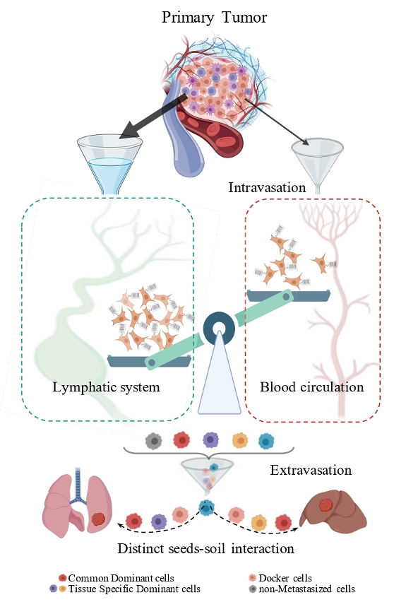 癌症转移是导致患者死亡的主要原因,但肿瘤细胞如何选择转移路径仍不明确。研究团队利用单细胞条码标记技术,追踪小鼠模型中乳腺癌细胞的迁移路径。结果显示,仅少于3%的肿瘤细胞通过血液循环扩散,而超过80%的转移细胞经由淋巴系统扩散至肺、肝等器官。进一步分析发现,淋巴转移的肿瘤细胞具有独特的基因表达模式,并与微环境中的基质细胞(如纤维母细胞、内皮细胞)通过细胞因子密切互动,形成“种子—土壤”适应性机制。
