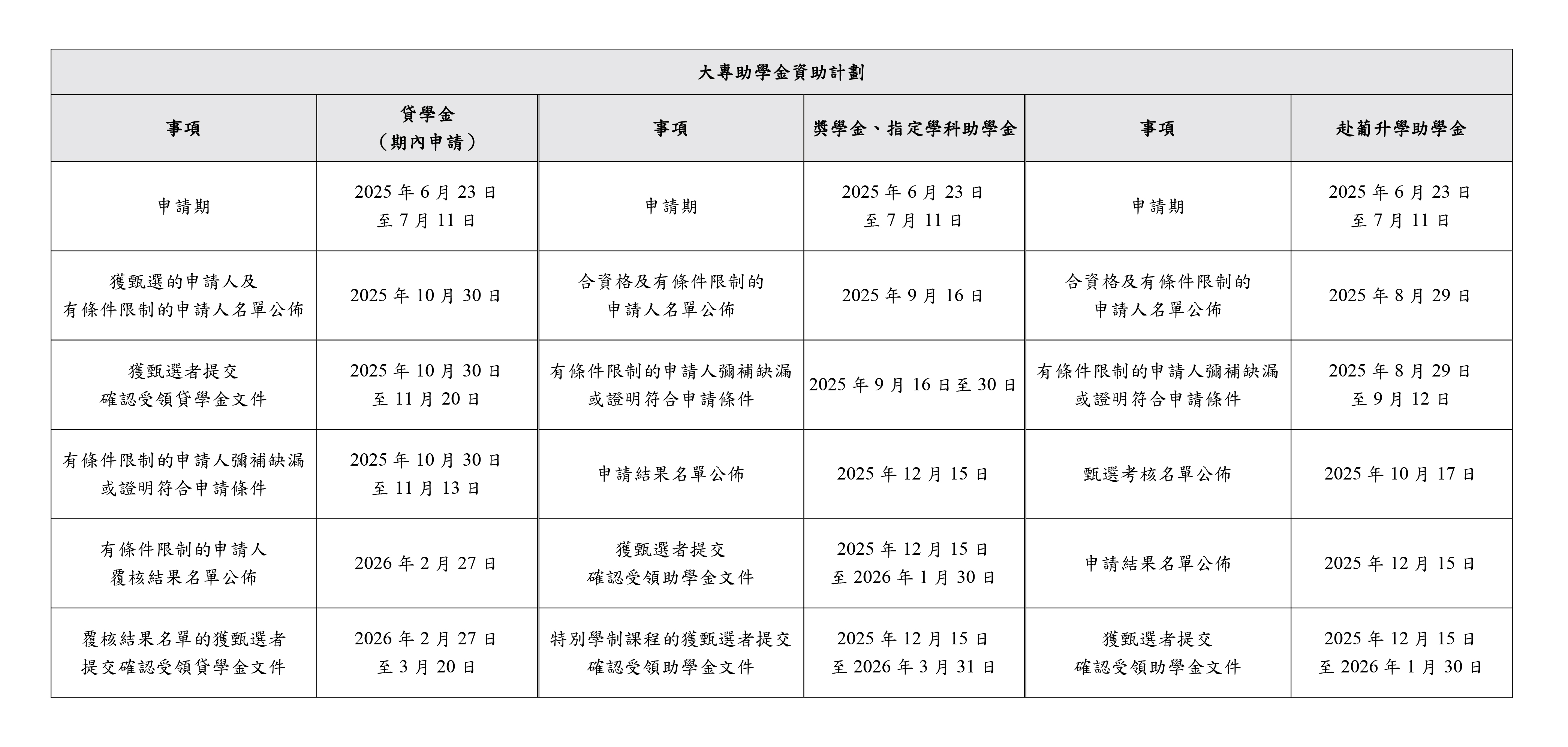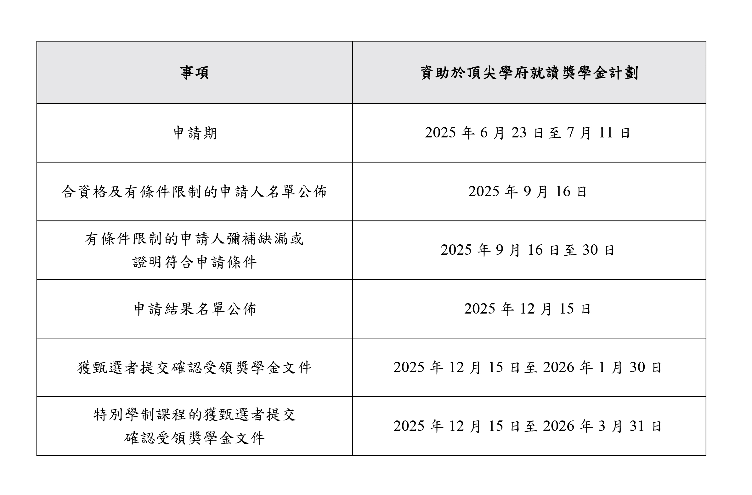 “资助于顶尖学府就读奖学金计划”申请期为6月23日至7月11日,资助对象为修读学士学位课程、学硕连读/学硕博连读学位课程的学士学习阶段申请人。同时,申请人升读的课程须为2025年《泰晤士高等教育世界大学排名》公布的各学科领域名列前50位,或经教育基金行政管理委员会接受的其他具公信力之世界大学专业排名中名列前10位。