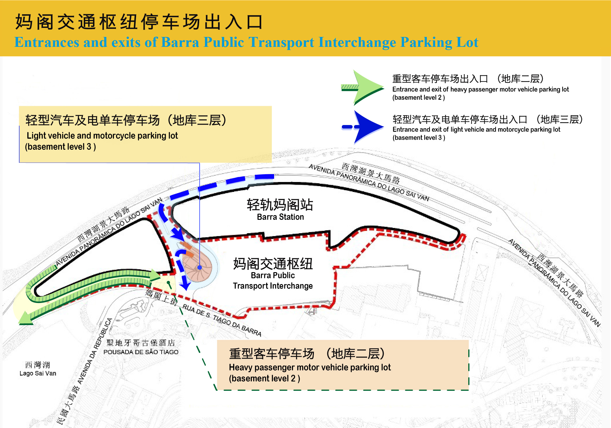 位于妈阁交通枢纽地库二层的重型客车停车场提供共27个重型客车泊位及6个临时上落客车位,出入口与巴士驶入交通枢纽的位置相同,驾驶者可沿西湾湖景大马路行驶西湾方向并按指示经分岔路进入停车场。