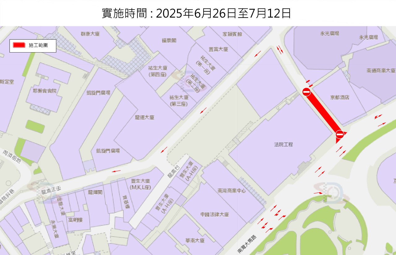 配合第一阶段施工需要,自2025年6月16日上午10时至6月26日上午10时,龙嵩正街至永光广场停车场出入口的一段傅礼士神父街将实施封闭交通,进入永光广场停车场的车辆可取道南湾大马路;自2025年6月26日上午10时至7月12日上午10时,南湾大马路至永光广场停车场出入口的一段傅礼士神父街将实施封闭交通,进入永光广场停车场的车辆须取道龙嵩正街。(详见附图)