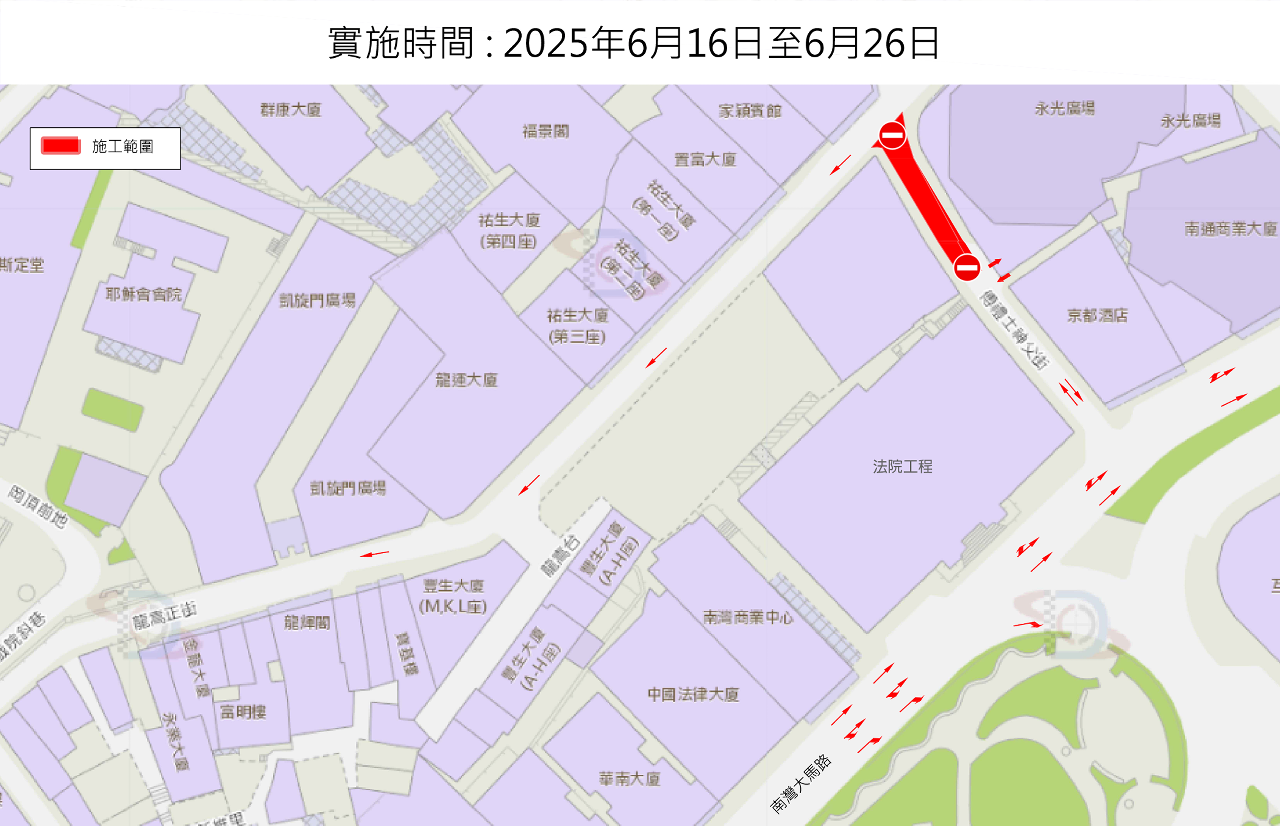 配合在建中的南湾大马路法院大楼工程的管线接驳工作,同时为避免同一区域在短期内再次开展工程,经跨部门协调,将一并进行区内交通设施的优化,如更改轻型汽车泊位长度、调整电单车泊车架为斜泊式等,傅礼士神父街、南湾大马路和龙嵩正街将于6月16日至8月22日分三阶段实施临时交通措施,具体安排如下: