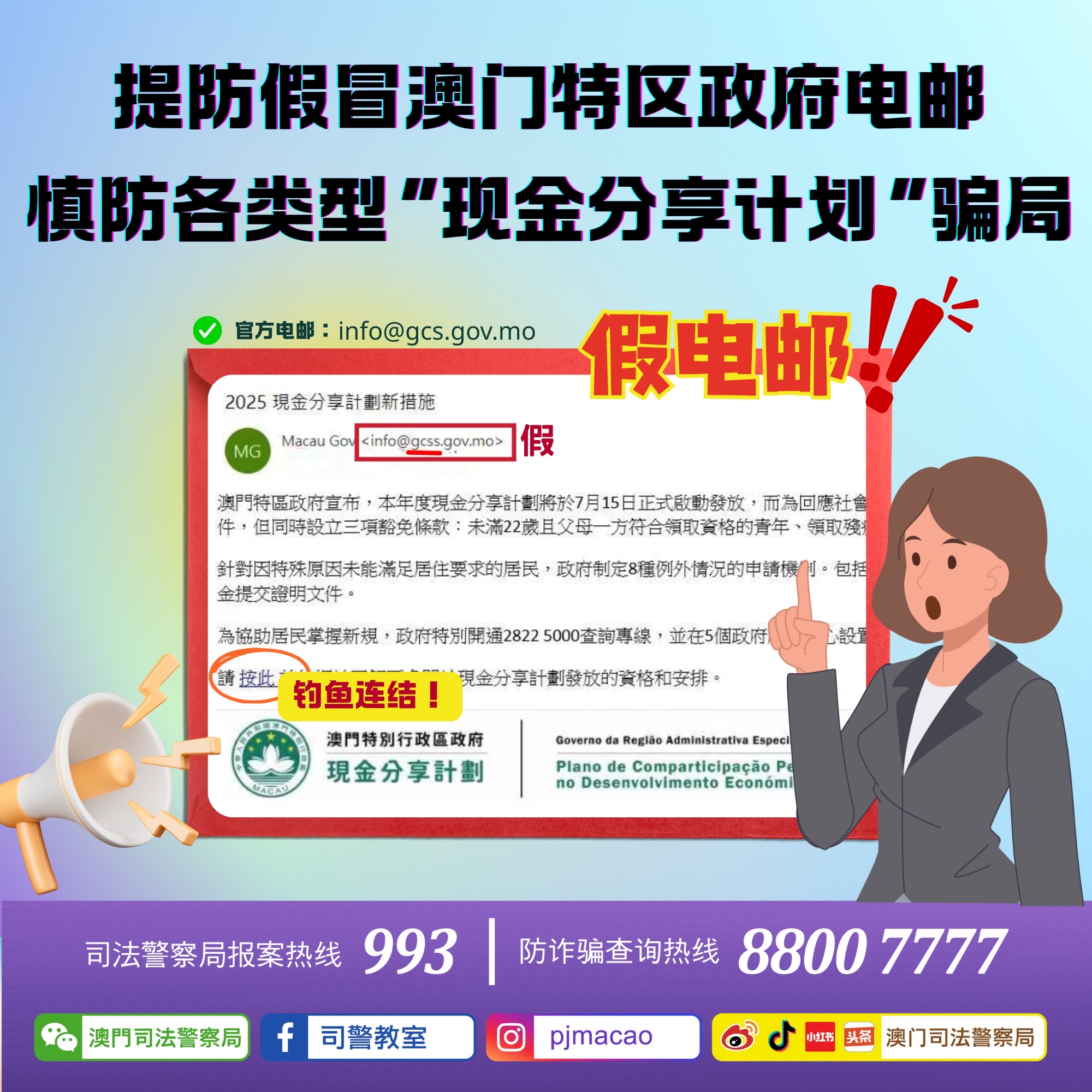 - 如有怀疑,应使用司警局“反诈程式”查核风险指数,又或致电司警局防诈骗查询热线88007777或报案热线993求助。