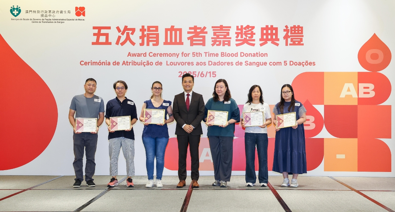 罗奕龙局长又强调,举办“五次捐血者嘉奖典礼”不仅是表彰捐血者的坚持与贡献,更希望透过公开嘉许,向社会传递互助精神与正能量,鼓励更多居民参与捐血行动,共同促进公众身心健康。数据显示,2024年澳门共有13,740位居民登记捐血,同时有3,626位患者接受合计16,158单位的血液或血液成分。他呼吁居民定期捐血,并邀请亲友、同事及同学加入捐血行列,以实际行动守护生命。