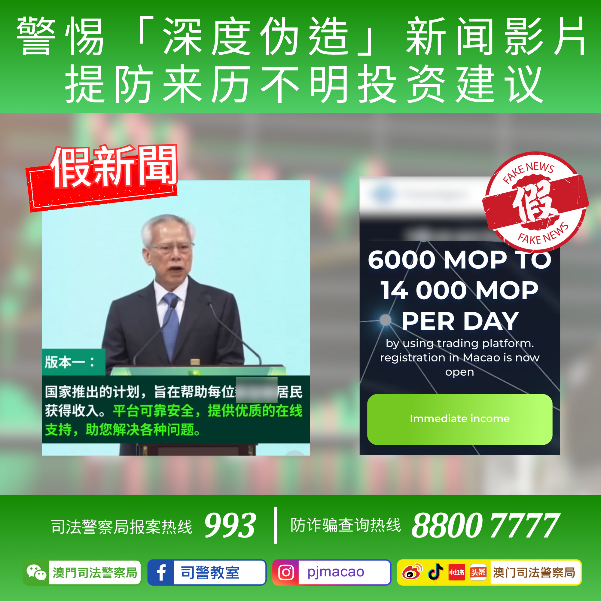 上述投资诈骗手法近年已陆续在不同国家及地区肆虐,骗徒借由伪造当地官员或名人受访影片推介高回报投资计划,并以小额获利吸引事主加大投入金额,最终造成事主巨额财产损失。而本澳继早前出现首宗涉及AI伪造影片的骗案后至今再度出现同类型骗局,显示骗徒正不断尝试假冒本澳不同知名人士伺机行骗。